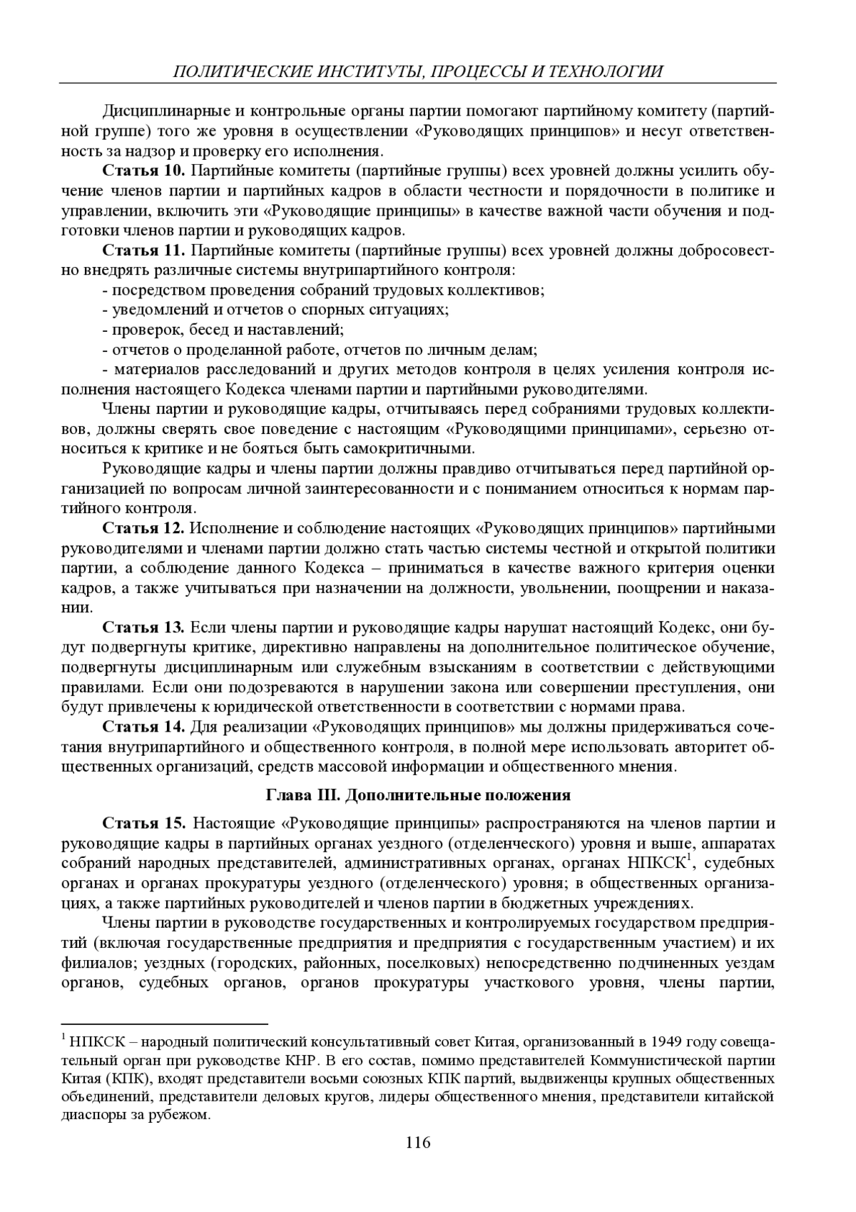 В представленном материале впервые на русском языке опубликован перевод документа «Руководящие принципы участия в политике и управлении партийных кадров и членов Коммунистической партии Китая (КПК)». В статье приводится полный текст с комментариями, дан его политологический и управленческий анализ. Проведен сравнительный анализ аналогичного регламента служебного поведения Российской Федерации.