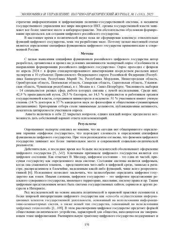 В статье с помощью анонимного экспертного опроса «Особенности и направления формирования российского цифрового государства» автор определяет специфику и основные функции цифрового государства, которыми применительно к современной России являются: защита суверенитета в цифровой среде, представление в киберпространстве цифрового состояния реального государства, внедрение технологических инноваций в процесс оказания государственных услуг, упрощение организационноуправленческих процедур, построение многочисленных и разнообразных каналов интерактивной коммуникации между государственным и частным секторами