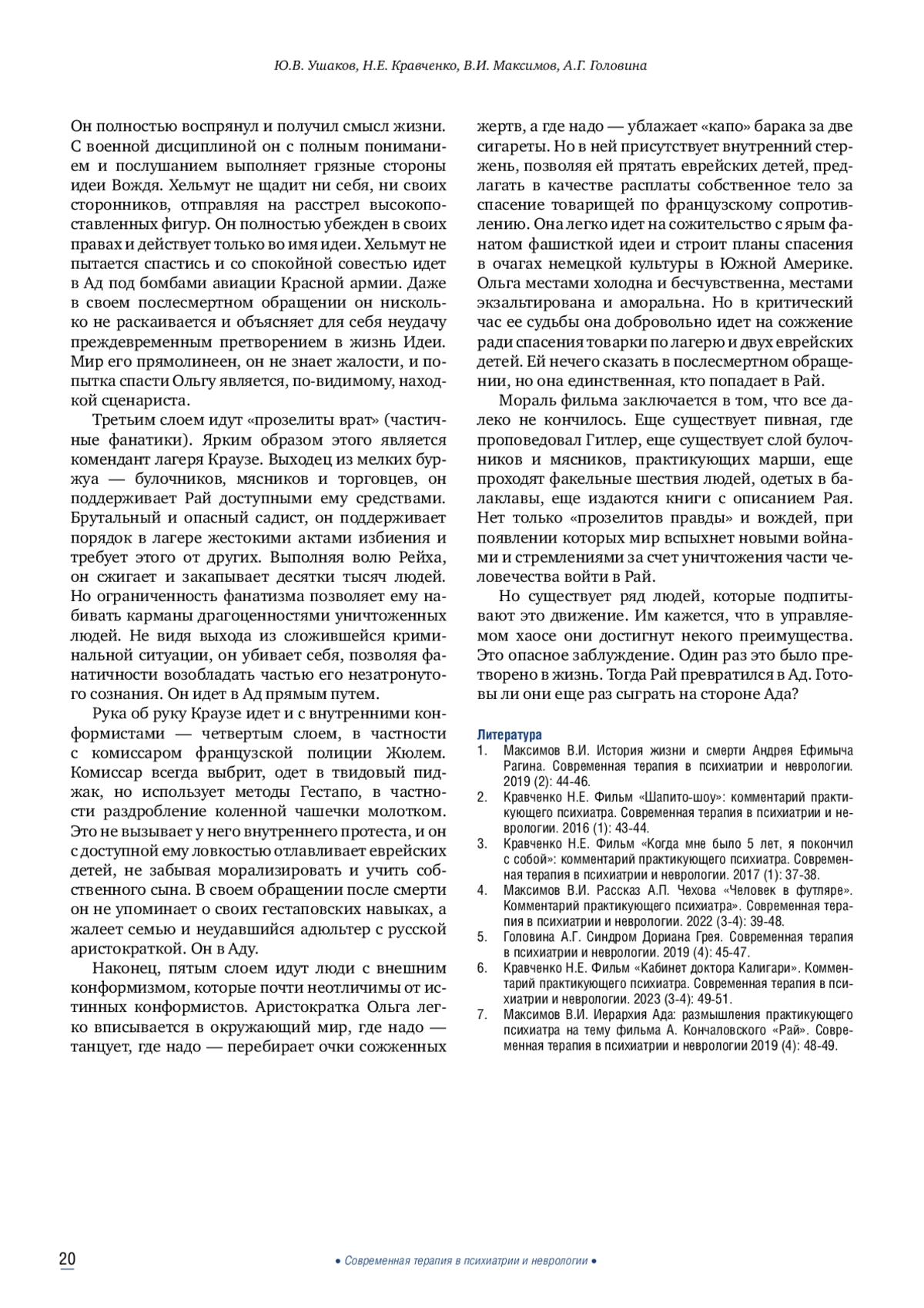 Одним из замыслов нашей образовательной работы являлась попытка показать, как некоторые клинические категории и понятия могут быть воплощены в литературных произведениях и киноискусстве, как искусство, работающее прежде всего с человеческими чувствами, переживаниями, эмоциями, воссоздает иногда с удивительной правдивостью особенности психопатологии. Другим стремлением было желание представить читателям нашего журнала собственно движение клинического мышления практикующего психиатра на примере анализа фильмов или литературных трудов, в которых герои страдают психическим расстройством. В частности, мы стремились продемонстрировать ту линию размышления, ту направленность интеллектуальной реакции, которая возникает в процессе формирования определенного диагностического суждения при оценке психопатологического феномена.