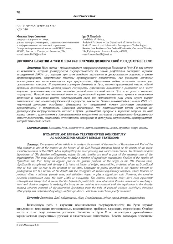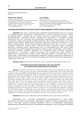 Цель статьи - проанализировать содержание договоров Византии и Руси X в. как одного из источников истории древнерусской государственности на основе результатов последних научных исследований 2000-х гг., выделив при этом наиболее актуальные и дискуссионные вопросы, а также проиллюстрировать современные гипотезы древнерусского политогенеза, где указанные договоры используются как часть смыслового ядра аргументации. Проделанная работа позволила сделать ряд существенных выводов. Исследования договоров Византии и Руси, являясь органической частью общей проблемы происхождения Древнерусского государства, существенно дополняют и развивают ее в части вопросов происхождения, состава, эволюции ранней политической элиты Руси и ее роли в создании государства. Полный или частичный отказ от марксистской версии политогенеза привел к оживлению дискуссии и появлению разных объяснительным схем, где существенную роль стали играть теории политических элит, военного (дружинного) государства, вождества. Однако накопившийся с начала 1990-х гг. творческий потенциал ослабевает. Имеющиеся на сегодняшний момент источники многократно переосмыслены и истолкованы. Создается впечатление, что позитивистский взгляд историка на древнерусскую государственность заходит в тупик. Дальнейший прогресс в изучении вопроса, на наш взгляд, связан с применением к уже имеющемуся конкретному материалу теоретического фундамента из области политологии, социологии, отечественной этнографии и культурной антропологии, юриспруденции, который пока слабо освоен.