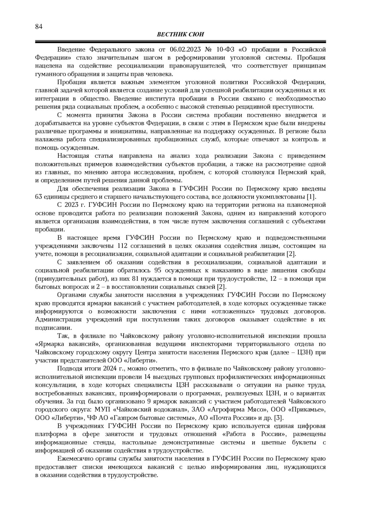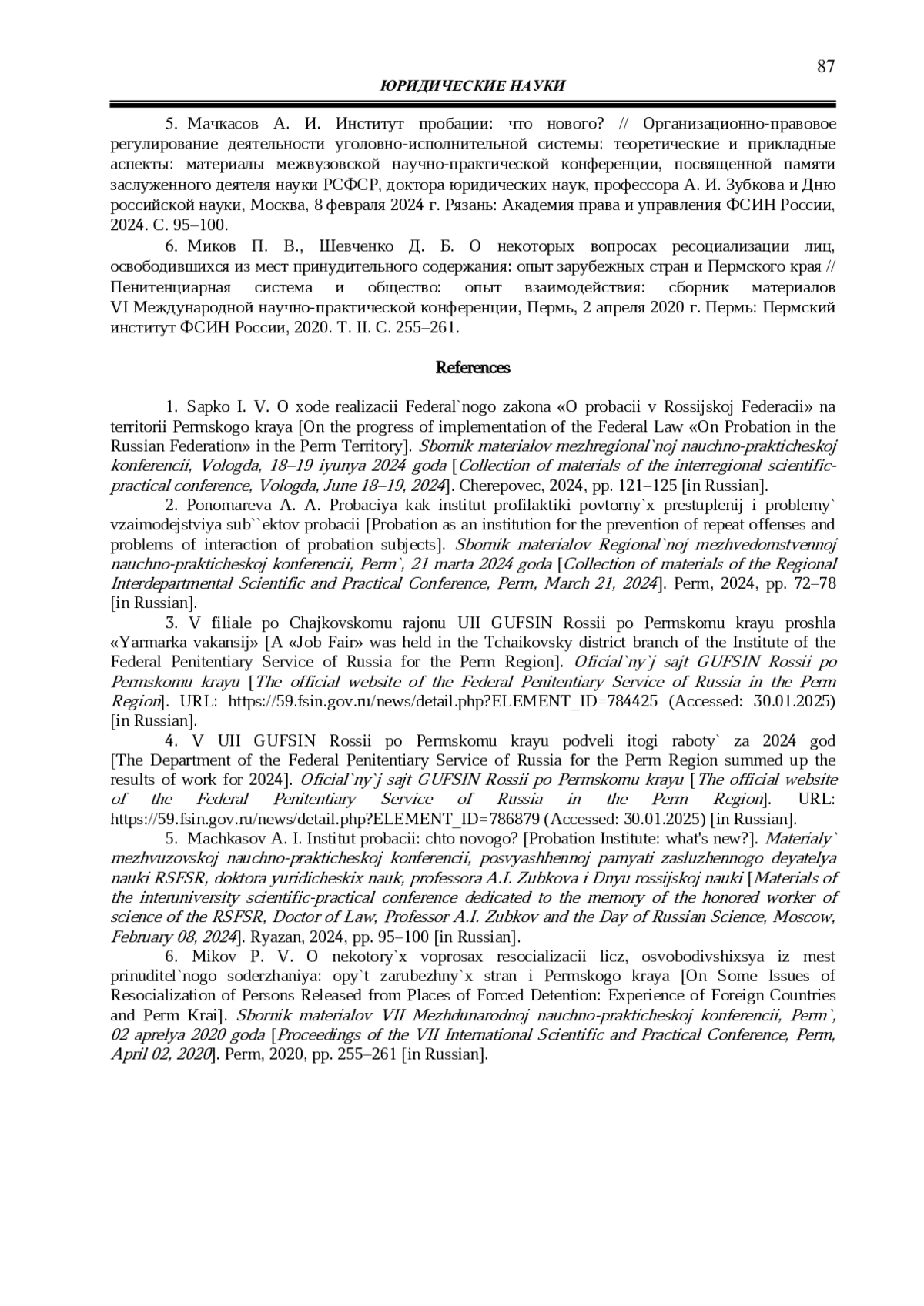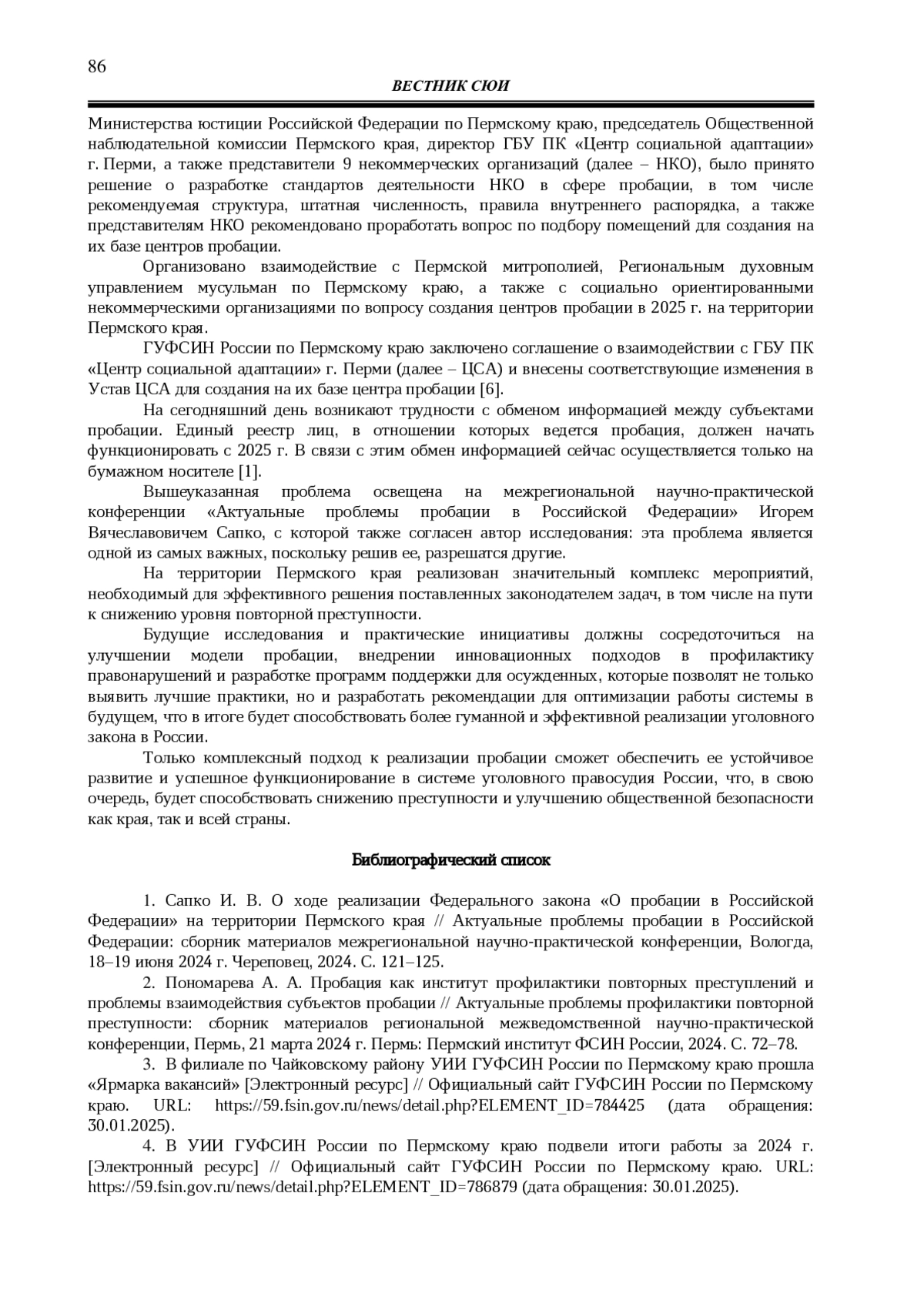 4. 	В УИИ ГУФСИН России по Пермскому краю подвели итоги работы за 2024 г. [Электронный ресурс] // Официальный сайт ГУФСИН России по Пермскому краю. URL: https://59.fsin.gov.ru/news/detail.php?ELEMENT_ID=786879 (дата обращения: 30.01.2025).