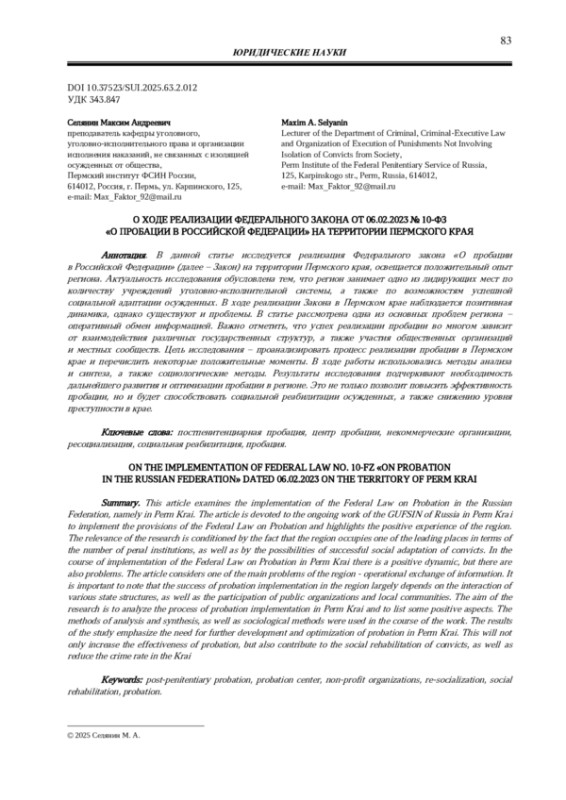 В данной статье исследуется реализация Федерального закона «О пробации в Российской Федерации» (далее - Закон) на территории Пермского края, освещается положительный опыт региона. Актуальность исследования обусловлена тем, что регион занимает одно из лидирующих мест по количеству учреждений уголовно-исполнительной системы, а также по возможностям успешной социальной адаптации осужденных. В ходе реализации Закона в Пермском крае наблюдается позитивная динамика, однако существуют и проблемы. В статье рассмотрена одна из основных проблем региона - оперативный обмен информацией. Важно отметить, что успех реализации пробации во многом зависит от взаимодействия различных государственных структур, а также участия общественных организаций и местных сообществ. Цель исследования - проанализировать процесс реализации пробации в Пермском крае и перечислить некоторые положительные моменты. В ходе работы использовались методы анализа и синтеза, а также социологические методы. Результаты исследования подчеркивают необходимость дальнейшего развития и оптимизации пробации в регионе. Это не только позволит повысить эффективность пробации, но и будет способствовать социальной реабилитации осужденных, а также снижению уровня преступности в крае.