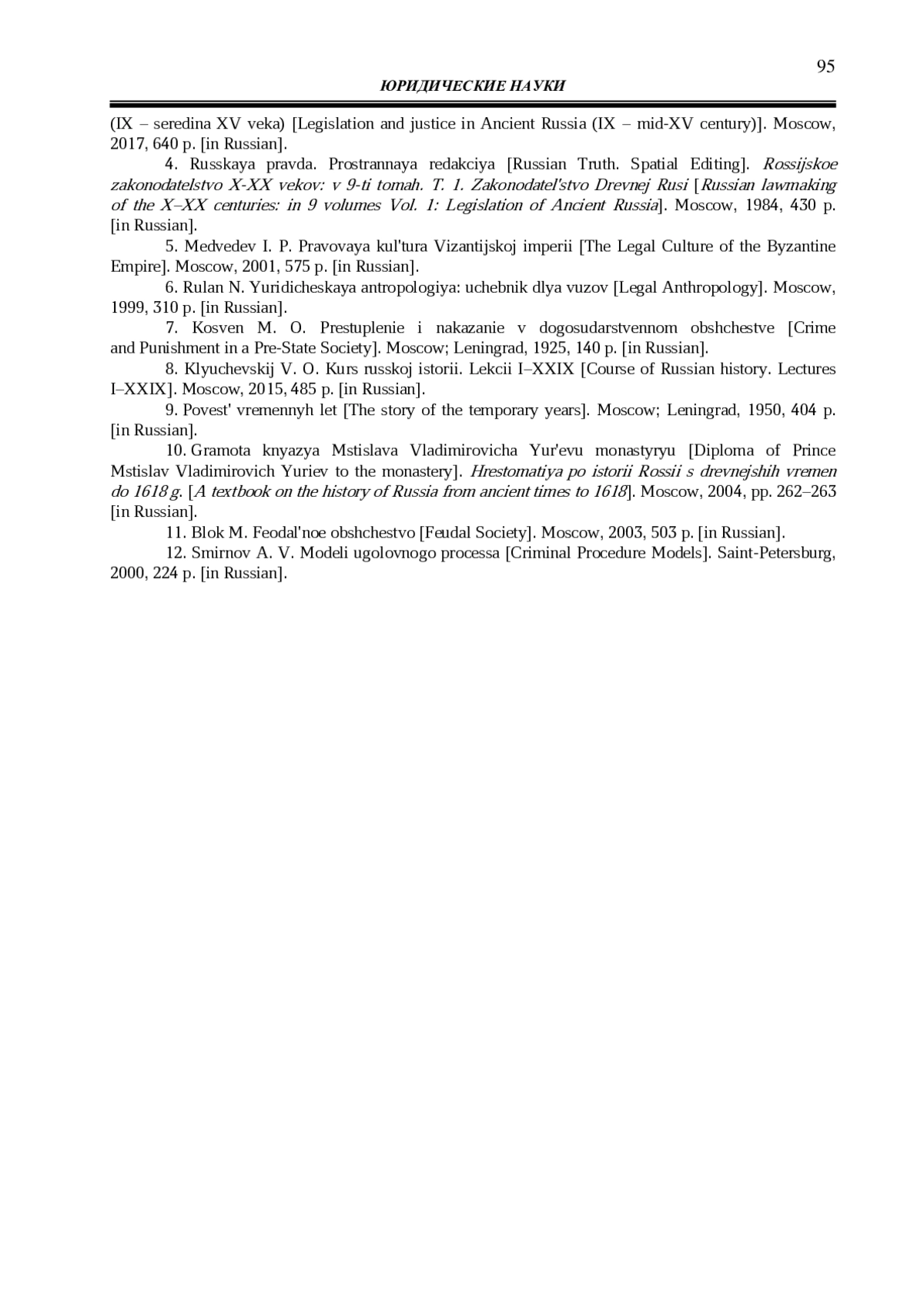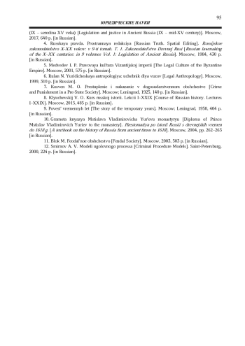 3. 	История суда и правосудия в России: в 9 т. Т. 1: Законодательство и правосудие в Древней Руси (IX - середина XV в.). М.: Норма: ИНФРА-М, 2017. 640 с.