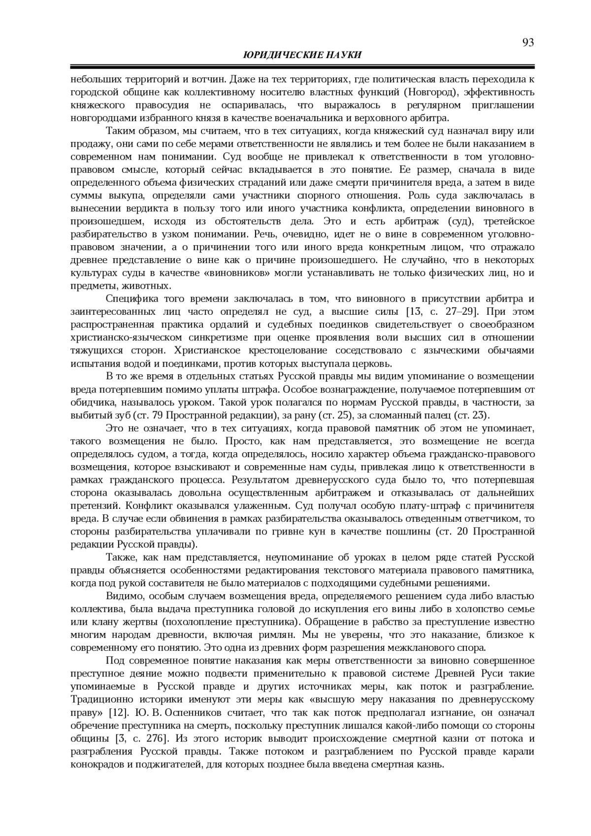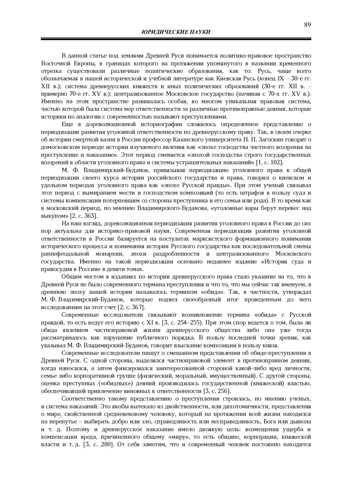 В данной статье под землями Древней Руси понимается политико-правовое пространство Восточной Европы, в границах которого на протяжении упомянутого в названии временного отрезка существовали различные политические образования, как то: Русь, чаще всего обозначаемая в нашей исторической и учебной литературе как Киевская Русь (конец IX – 30-е гг. XII в.); система древнерусских княжеств и иных политических образований (30-е гг. XII в. – примерно 70-е гг. XV в.); централизованное Московское государство (начиная с 70-х гг. XV в.). Именно на этом пространстве развивалась особая, во многом уникальная правовая система, частью которой была система мер ответственности за различные противоправные деяния, которые историки по аналогии с современностью называют преступлениями.