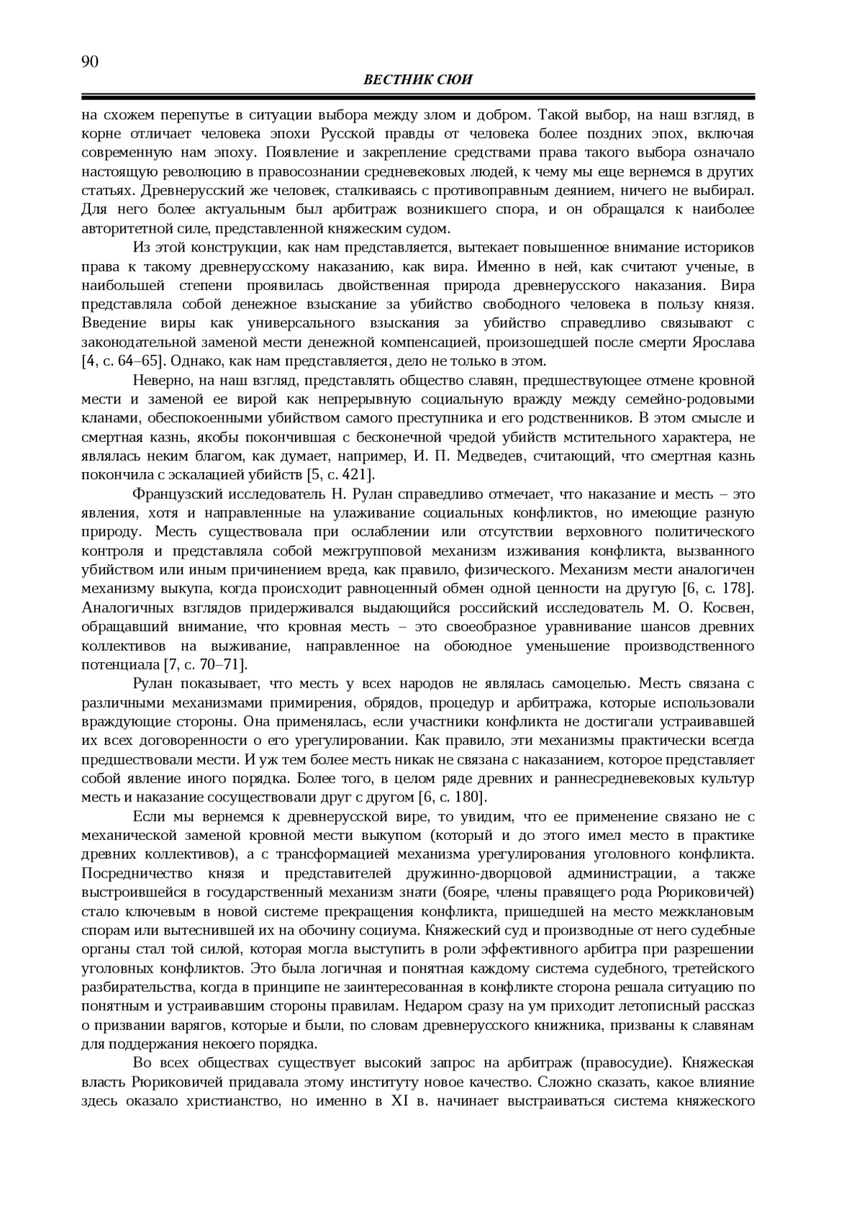 Статья посвящена определению значения системы штрафов (вир и продаж) в Древнерусском государстве X-XV вв. Показывается, что система штрафов, упомянутых в Русской правде, к мерам ответственности за правонарушения против личности и собственности не относилась, а являлась своеобразной платой за правосудие, доходной статьей княжеской юстиции, монополизировавшей арбитраж конфликтов межличностного и межкланового характера. В этом контексте отмену кровной мести и передачу спора на княжеский арбитраж предлагается рассматривать как трансформацию различных традиций, связанных с разрешением конфликтов, которые бытовали у славян и русичей еще до призвания Рюрика и христианизации восточнославянского населения. Также подчеркивается, что князья отменили кровную месть не потому, что она тотально угрожала обществу, а потому, что улаживание конфликта с целью недопущения кровной мести как крайней степени его развития было практически полностью отнесено к княжеской юрисдикции; мерами ответственности являлись не виры и продажи, а компенсация за причиненный вред, которую получали потерпевший и члены его семейно-клановой группы по результатам рассмотрения дела судом княжеской или вотчинной юстиции.