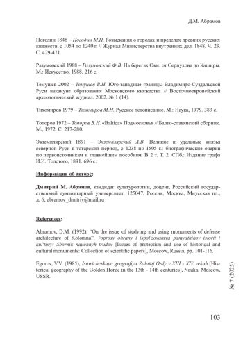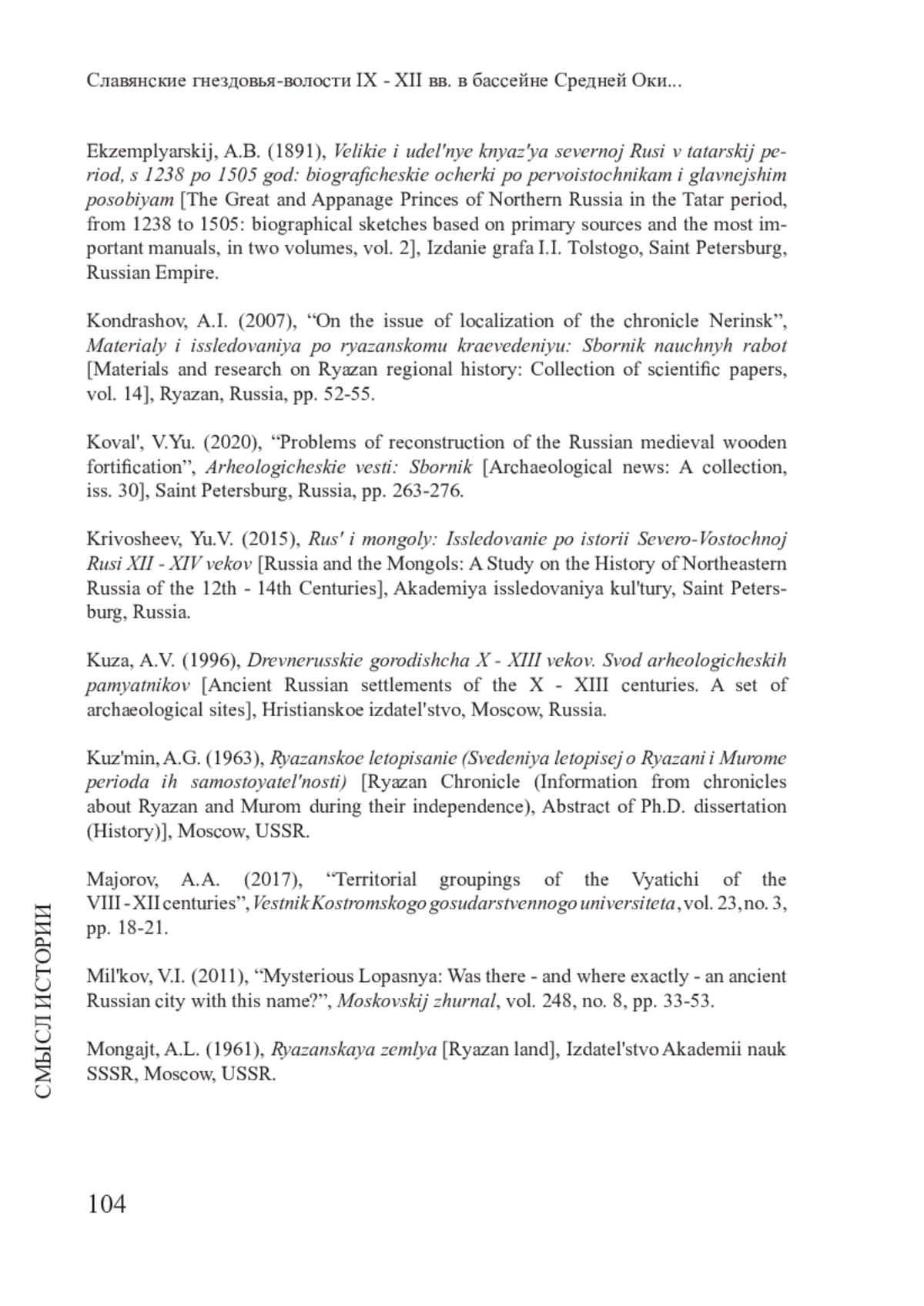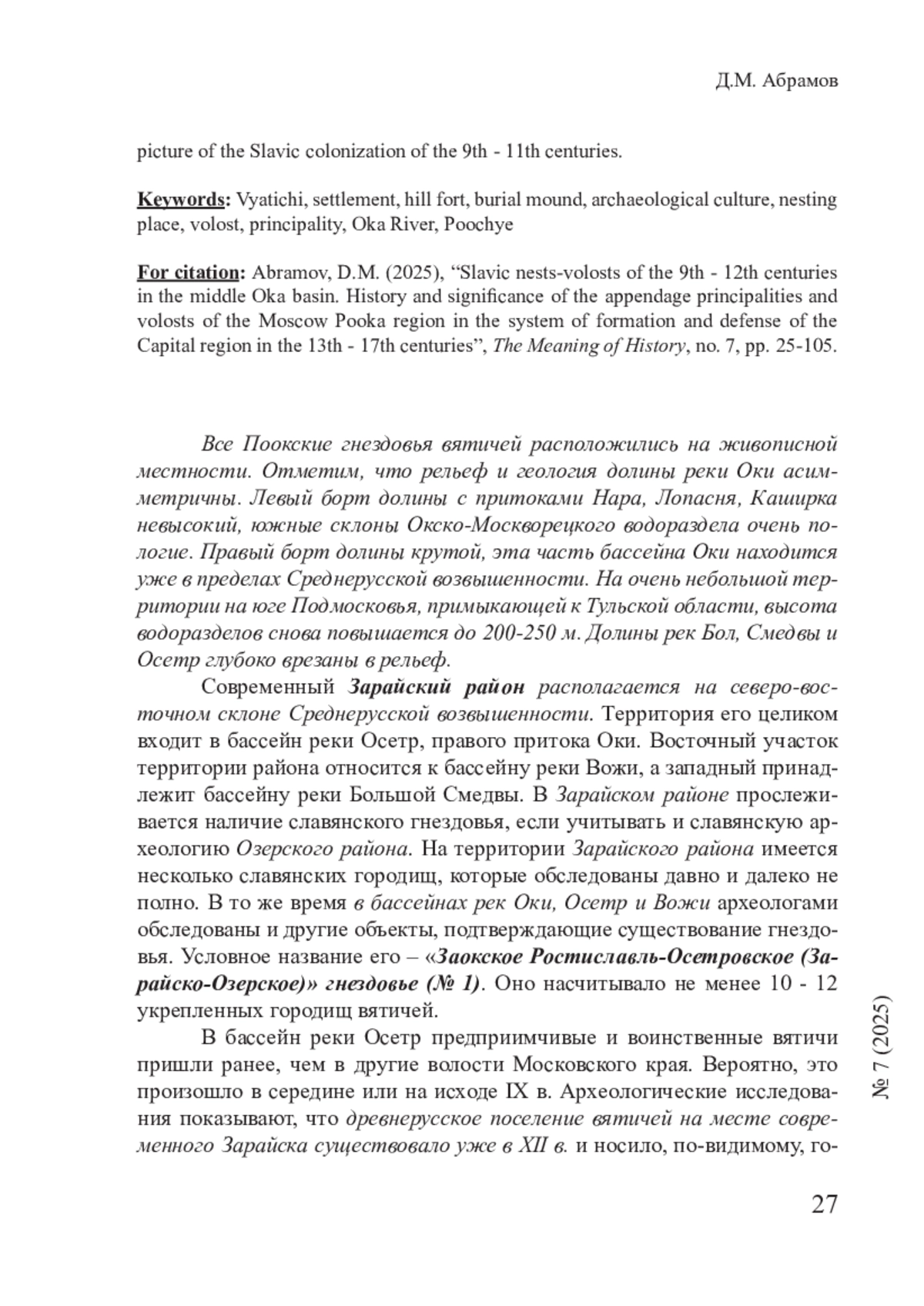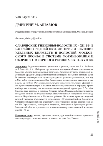 Ряд отечественных археологов и ученых, таких как Б. А. Рыбаков, А. Л. Монгайт, А. А. Майоров и др., отметили важную особенность колонизации бассейна Москвы-реки славянами-вятичами. Исходным пунктом славянской колонизации средней Оки рассматриваются вятические поселения верхнего Дона. В качестве характеристики уровня культурного развития указывается, что еще в X в. район среднего течения Оки был недавно колонизирован вятичами, а уже в XI в. на средней Оке «наблюдался расцвет городской культуры». Данный тезис ярко свидетельствует о наличии множества укрепленных городищ, крепостей-градов, воздвигнутых вятичами на колонизируемой территории. В бассейне Москвы-реки западнее и севернее Рузского района Московской области наличие гнездовий вятичей не прослеживается. Нет укрепленных гнездовий и юго-западнее – в Наро-Фоминском и Чеховском районах. На востоке граница гнездовий вятичей упирается в Мещерскую низменность – Егорьевский район. Вероятно, и Серебрянопрудский район в археологическом отношении изучен довольно неполно. Но Серпуховской, Каширский, Озерский, Зарайский и Луховицкий районы Московской области представляют великолепную картину славянской колонизации IX - XI вв.