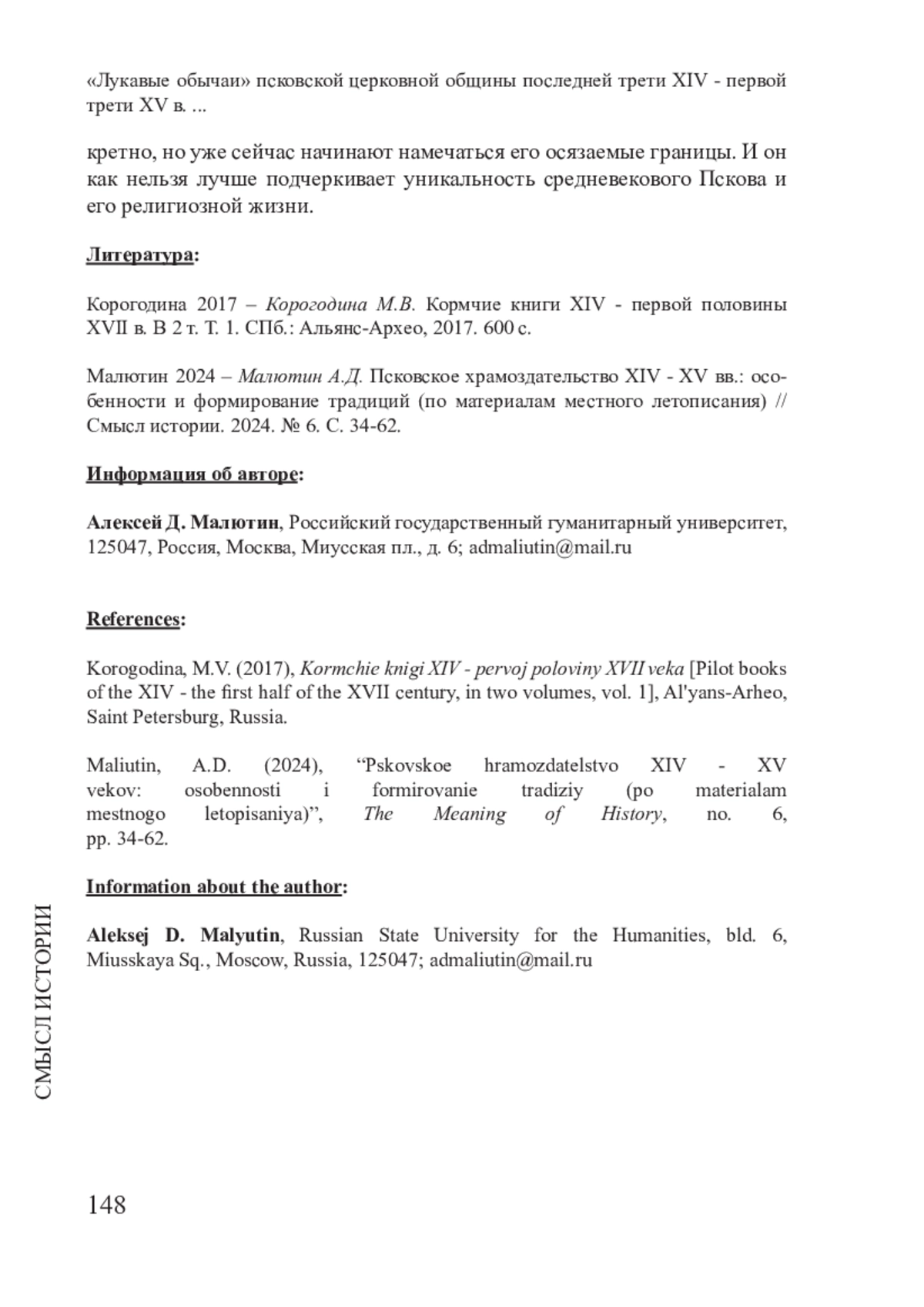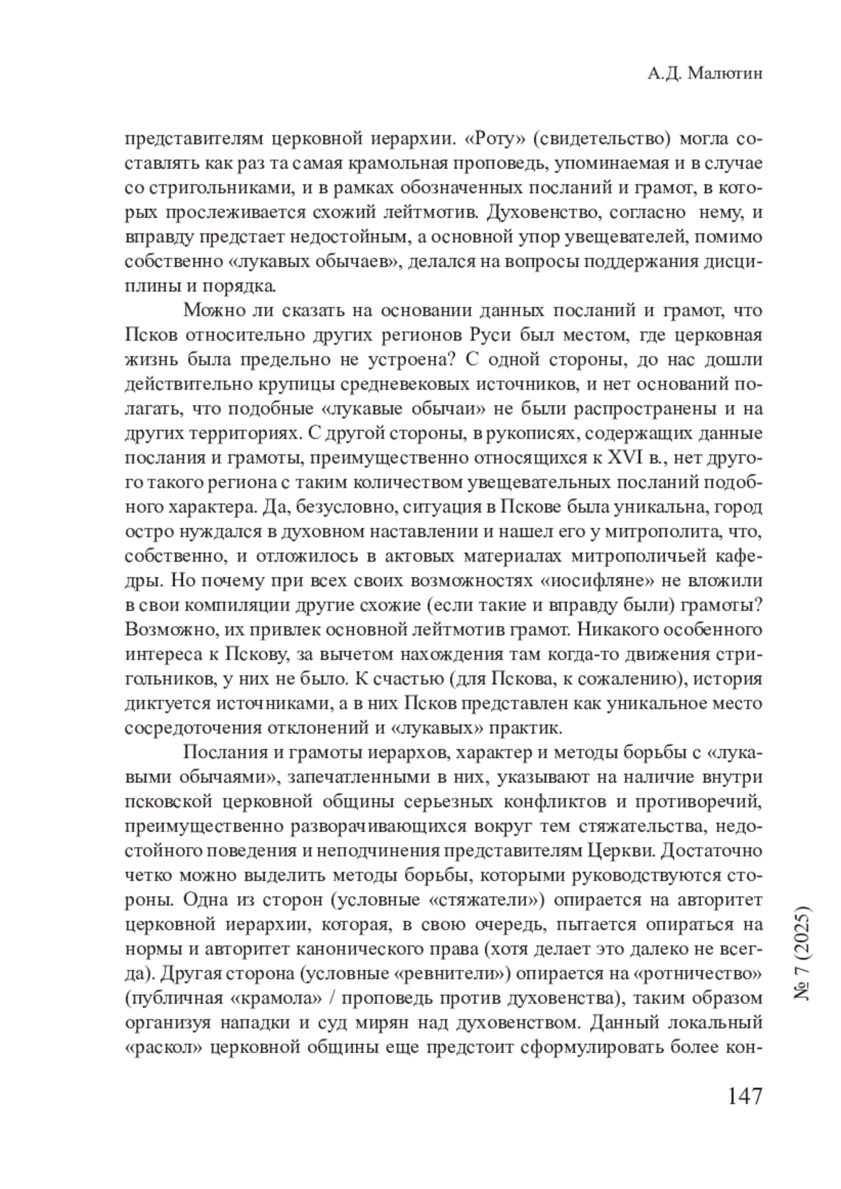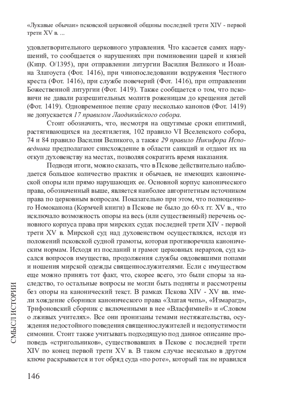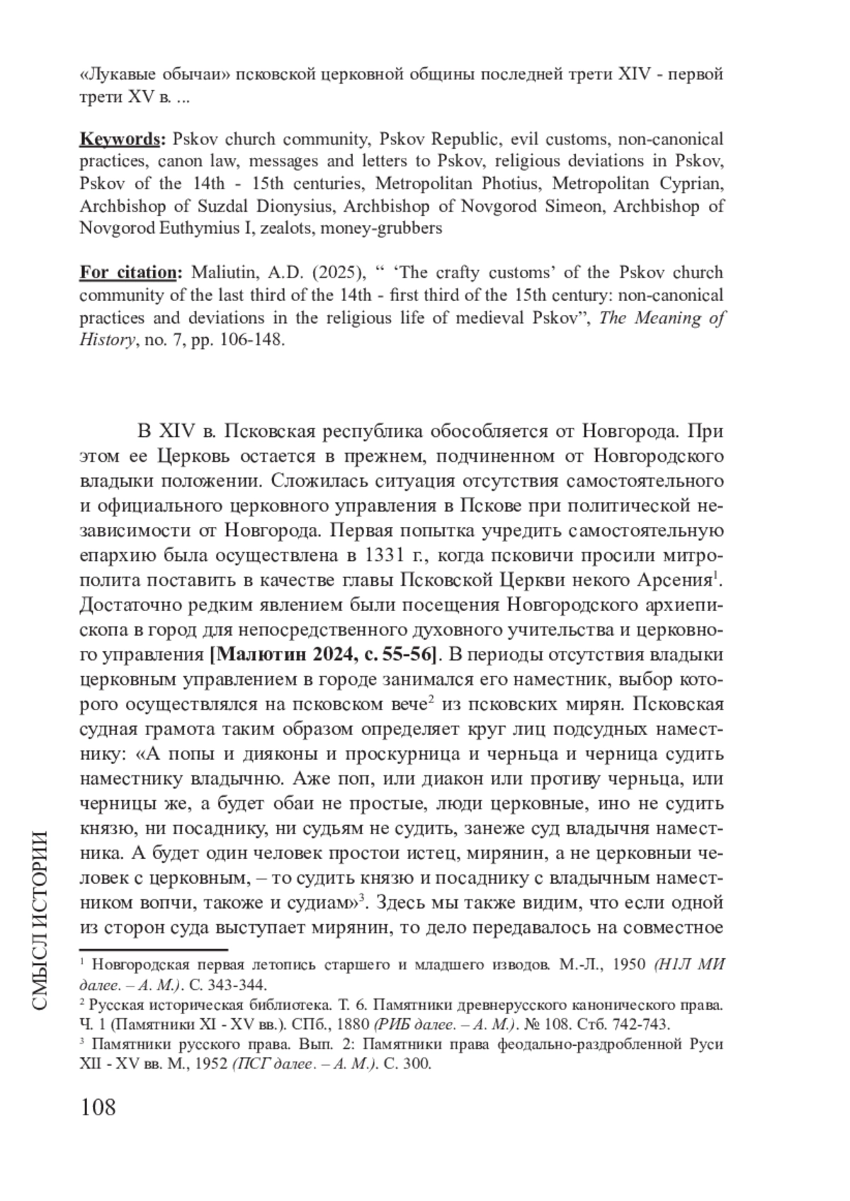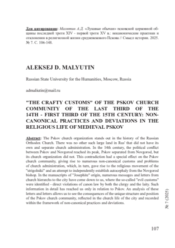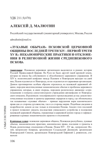 Псковская церковная организация выделяется в рамках истории Русской Православной Церкви. На Руси не было другой такой крупной земли, которая не имела бы собственного и обособленного церковного управления. В XIV в. политический конфликт между Псковом и Новгородом выходит на свой пик, Псков отделяется от Новгорода, но не отделяется его церковная организация. Данное противоречие особым образом отразилось на псковской церковной общине, породив многочисленные неканонические обычаи и проблемы церковного управления, которые, в свою очередь, породили религиозное движение «стригольников» и попытку самостоятельного учреждения автокефалии от Новгородского епископа. В рукописях «иосифлянского» происхождения до нас дошли многочисленные послания и грамоты церковных иерархов в город, где обозначались так называемые «лукавые обычаи» – прямые нарушения норм канонического права как со стороны духовенства, так и со стороны мирян. Подобные сведения в подробностях дошли до нас только в отношении Пскова. Анализ этих посланий и грамот позволяет увидеть последствия уникального устройства и положения псковской церковной общины, отраженные в церковной жизни города и зафиксированные в рамках неканонических практик и отклонений.