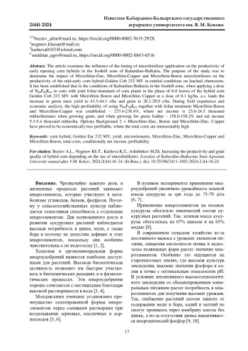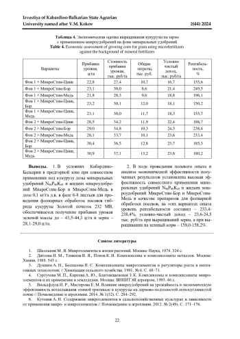 В статье рассматривается влияние сроков внесения микроудобрений на продуктивность раннеспелых гибридов кукурузы в предгорной зоне Кабардино-Балкарии. Целью исследования было определение воздействия микроудобрений МикроСтим-Цинк, МикроСтим-Медь и МикроСтим-Бор на продуктивность среднераннего гибрида кукурузы Золотой початок 232 МВ в богарных условиях на выщелоченном черноземе. Установлено, что в условиях Кабардино-Балкарии в предгорной зоне при внесении под кукурузу дозы N90Р90K45 с совместной некорневой обработкой кукурузных растений фазе 6-8 листьев гибрида кукурузы Золотой початок 232 МВ препаратами МикроСтим Бор и МикроСтим Медь в дозе 0,1 кг/га д. в. повышает прибавку урожая зеленой массы до 43,5-44,3 ц/га и зерна 28,1-29,0 ц/га. B ходе проведения полевого опыта и экономического анализа установлена высокая рентабельность применения N90Р90K45 совместно с фолиарной обработкой МикроСтим-Бор и МикроСтимМедь - 233,4-238,4%, где чистый доход - 23,6-24,5 тыс. руб/га при выращивании зерна, а при выращивании на зеленый корм - 158,0-158,2% и чистый доход 5,3-5,4 тыс. руб/га. Варианты Фон 2 + МикроСтим-Цинк, Бор и МикроСтим-Цинк, Медь проявили себя экономически менее рентабельными, где общие затраты неоправданно высокие.