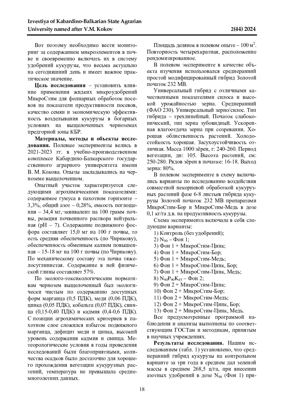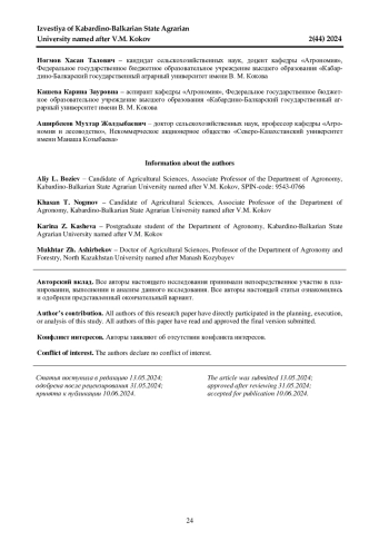 Данная статья посвящена изучению влияния стимулятора роста растений и комплексного водорастворимого удобрения на хозяйственно-ценные признаки и зерновую продуктивность гибридов кукурузы. Полевые эксперименты проводились в 2021-2023 гг. в учебно-производственном комплексе Кабардино-Балкарского государственного аграрного университета имени В. М. Кокова. Опыты закладывались на черноземе выщелоченном. Опытный участок характеризуется следующими агрохимическими показателями: содержимое гумуса в пахотном горизонте - 3,3%, общий азот - 0,28%, емкость поглощения - 34,4 мг∙эквивалент на 100 грамм почвы, реакция почвенного раствора нейтральная (рН - 7). Содержание подвижного фосфора составляет 15,0 мг на 100 г почвы, то есть средняя обеспеченность (по Чирикову), обеспеченность обменным калием повышенная - 15-18 мг на 100 г почвы (по Чирикову). По механическому составу эта почва тяжелосуглинистая. Содержание в ней физической глины составляет 57%. Целью исследований было определение влияния стимулятора роста растений и комплексного водорастворимого удобрения на хозяйственно-ценные признаки и зерновую продуктивность среднераннего гибрида кукурузы Родник 292 МВ и среднеспелого гибрида кукурузы Диана МВ. Установлено, что применение стимулятора роста растений Регоплант и комплексного водорастворимого удобрения Плантафол увеличили высоту растения на 3,7%, длину початка на 10,6-13,5%, количество зѐрен в початке на 24,2-26,3%, массу зерна с одного початка на 15,8-35,9% и массу 1000 зѐрен на 7,5-9,4%, а также максимально увеличило урожайность у гибрида Родник 292 МВ до 8,16-8,96 т/га и гибрида Диана МВ до 10,0-10,32 т/га, где сбор кормовых единиц достигал 12,6-13,8 т/га для гибрида кукурузы Родник 292 МВ и у гибрида Диана МВ - 15,7-16,1 т/га. При этом содержание белка выросло у гибридов кукурузы Родник 292 МВ до 13,2-18,4% и Диана МВ до 11,8-29,4%.