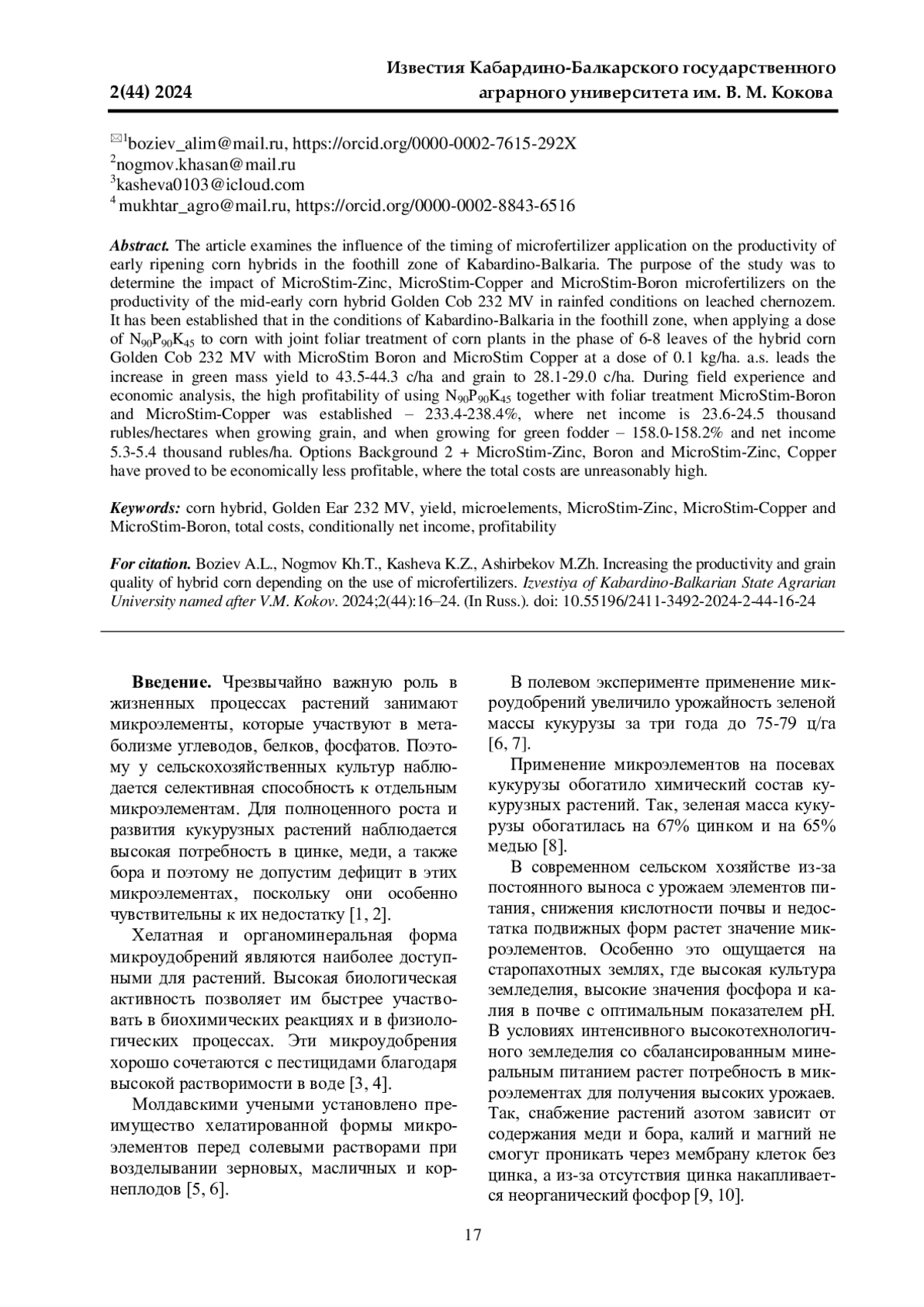 10. Шогенов Ю. М., Шибзухов З. Г. С., Темиржанов А. М. Возделывание кукурузы с использованием жидких хелатных микроудобрений МикроСтим в условиях КБР // Достижения и перспективы реализации национальных проектов развития АПК: материалы VIII Международной научно-практической конференции, посвященной памяти заслуженного деятеля науки РФ и КБР, профессора Б. Х. Жерукова. Нальчик, 2020. С. 102-107. EDN: LJUWRU