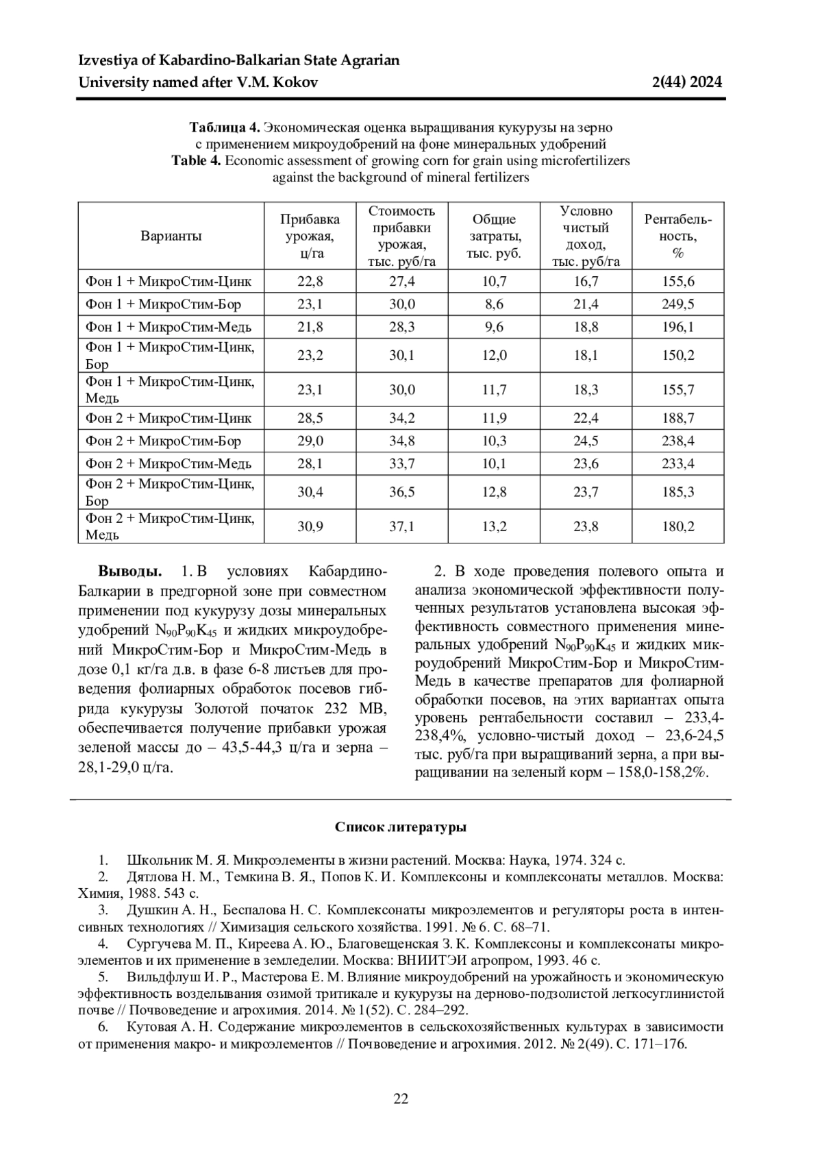 5. Вильдфлуш И. Р., Мастерова Е. М. Влияние микроудобрений на урожайность и экономическую эффективность возделывания озимой тритикале и кукурузы на дерново-подзолистой легкосуглинистой почве // Почвоведение и агрохимия. 2014. № 1(52). С. 284-292.