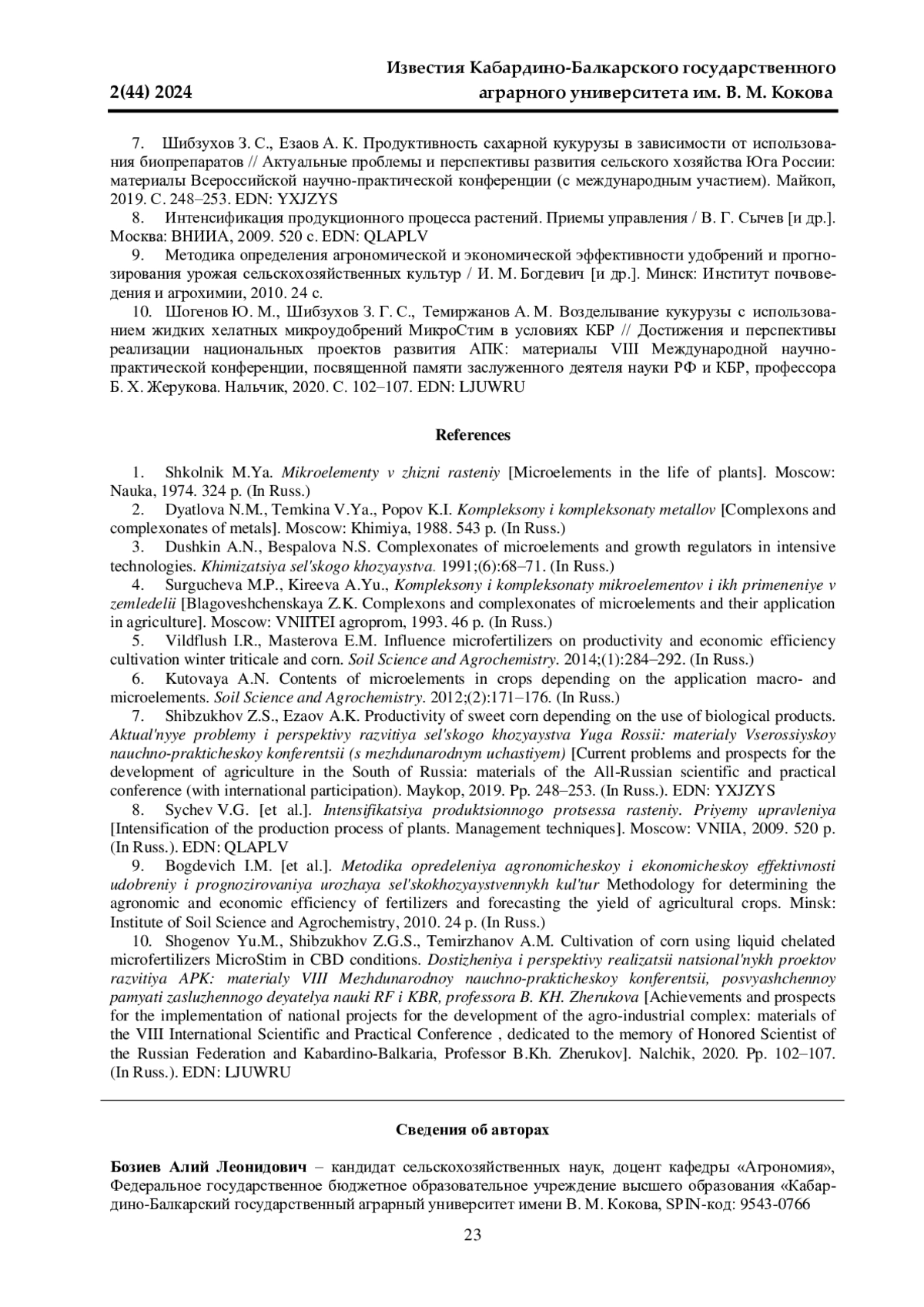 7. Шибзухов З. С., Езаов А. К. Продуктивность сахарной кукурузы в зависимости от использования биопрепаратов // Актуальные проблемы и перспективы развития сельского хозяйства Юга России: материалы Всероссийской научно-практической конференции (с международным участием). Майкоп, 2019. С. 248-253. EDN: YXJZYS