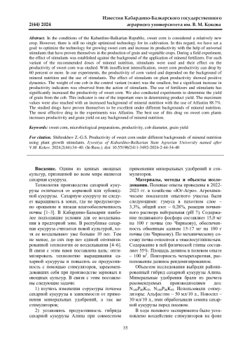 Данная статья посвящена изучению влияния стимулятора роста растений и комплексного водорастворимого удобрения на хозяйственно-ценные признаки и зерновую продуктивность гибридов кукурузы. Полевые эксперименты проводились в 2021-2023 гг. в учебно-производственном комплексе Кабардино-Балкарского государственного аграрного университета имени В. М. Кокова. Опыты закладывались на черноземе выщелоченном. Опытный участок характеризуется следующими агрохимическими показателями: содержимое гумуса в пахотном горизонте - 3,3%, общий азот - 0,28%, емкость поглощения - 34,4 мг∙эквивалент на 100 грамм почвы, реакция почвенного раствора нейтральная (рН - 7). Содержание подвижного фосфора составляет 15,0 мг на 100 г почвы, то есть средняя обеспеченность (по Чирикову), обеспеченность обменным калием повышенная - 15-18 мг на 100 г почвы (по Чирикову). По механическому составу эта почва тяжелосуглинистая. Содержание в ней физической глины составляет 57%. Целью исследований было определение влияния стимулятора роста растений и комплексного водорастворимого удобрения на хозяйственно-ценные признаки и зерновую продуктивность среднераннего гибрида кукурузы Родник 292 МВ и среднеспелого гибрида кукурузы Диана МВ. Установлено, что применение стимулятора роста растений Регоплант и комплексного водорастворимого удобрения Плантафол увеличили высоту растения на 3,7%, длину початка на 10,6-13,5%, количество зѐрен в початке на 24,2-26,3%, массу зерна с одного початка на 15,8-35,9% и массу 1000 зѐрен на 7,5-9,4%, а также максимально увеличило урожайность у гибрида Родник 292 МВ до 8,16-8,96 т/га и гибрида Диана МВ до 10,0-10,32 т/га, где сбор кормовых единиц достигал 12,6-13,8 т/га для гибрида кукурузы Родник 292 МВ и у гибрида Диана МВ - 15,7-16,1 т/га. При этом содержание белка выросло у гибридов кукурузы Родник 292 МВ до 13,2-18,4% и Диана МВ до 11,8-29,4%.