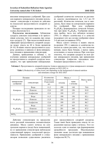 В условиях Кабардино-Балкарской республики сахарная кукуруза считается относительно новой культурой. Тем не менее, до сих пор нет единой оптимизированной технологии ее возделывания. В связи с этим нами поставлена цель: оптимизировать технологию выращивания сахарной кукурузы и повысить ее продуктивность с помощью универсальных стимуляторов, зарекомендовавших себя при производстве зерновых и овощных культур. В ходе полевого эксперимента было установлено воздействие стимуляторов на фоне внесения минеральных удобрений. При каждом варианте рекомендуемых доз минерального питания использовали стимуляторы и изучали их действие на показатели продуктивности сахарной кукурузы. При недостаточной интенсификации продуктивность сахарной кукурузы может снизится на 60 и более процентов. В наших опытах продуктивность кукурузы разнилась и зависела от фона минерального питания и применения стимуляторов. Действие стимуляторов на продуктивность растений показывала положительную динамику. Масса одного початка на контрольном варианте (вода) была наименьшей, но от действия стимуляторов наблюдался существенный прирост показателей продуктивности. Применение удобрений и стимуляторов позволили существенно увеличить рост продуктивности сахарной кукурузы. Также нами были проведены опыты по определению выхода зерна с початка. Этот показатель один из важных при формировании урожайности продукции. Максимальные значения также достигали при повышенном фоне минерального питания с применением Альфастим 88,7%. Изучаемые препараты прекрасно себя зарекомендовали при разных фонах минерального питания. Наиболее эффективным препаратом в опытах был Альфастим. Использование этого препарата лучше всех на растениях сахарной кукурузы повышает продуктивность и выход зерна на любом фоне минерального питания.