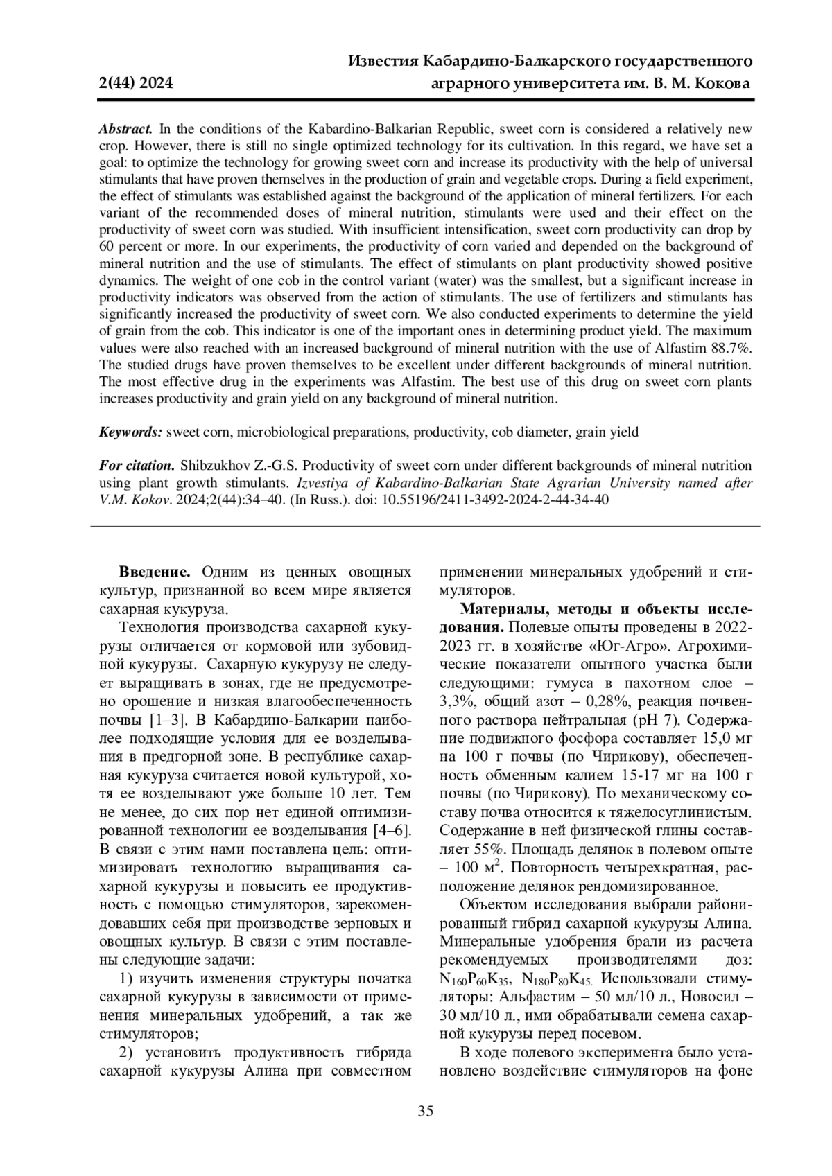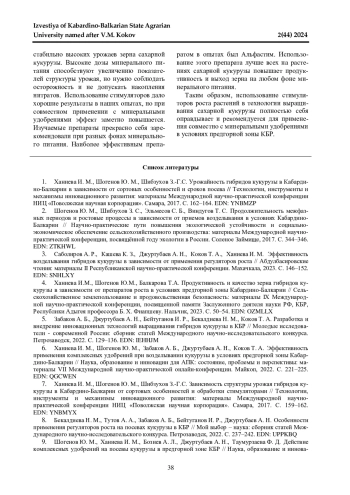 3. 	Саболиров А. Р., Кашева К. З., Джуртубаев А. Н., Коков Т. А., Ханиева И. М. Эффективность возделывания гибридов кукурузы в зависимости от применения регуляторов роста // Абдулбасировские чтения: материалы II Республиканской научно-практической конференции. Махачкала, 2023. С. 146-152. EDN: SNHLXY