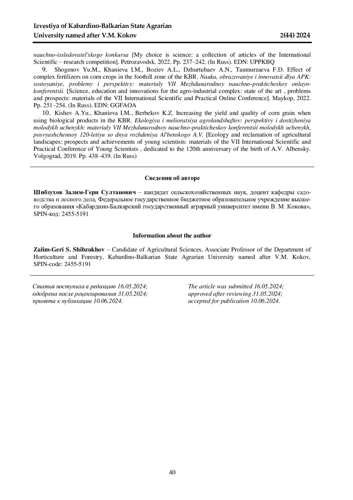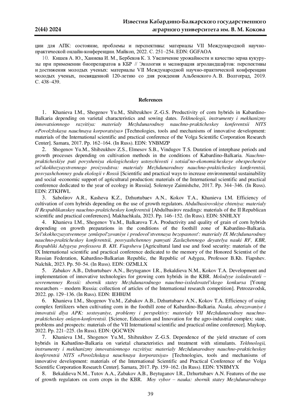 10. 	Кишев А. Ю., Ханиева И. М., Бербеков К. З. Увеличение урожайности и качество зерна кукурузы при применении биопрепаратов в КБР // Экология и мелиорация агроландшафтов: перспективы и достижения молодых ученых: материалы VII Международной научно-практической конференции молодых ученых, посвященной 120-летию со дня рождения Альбенского А. В. Волгоград, 2019. С. 438-439. EDN: ORNNEP