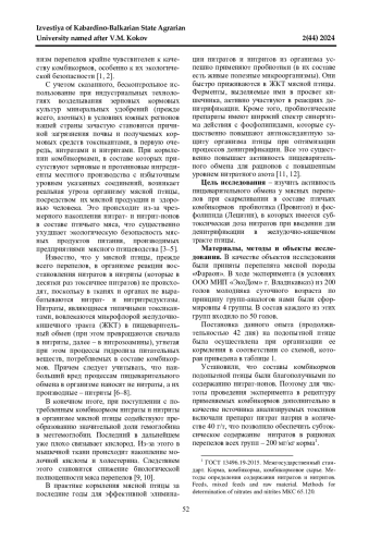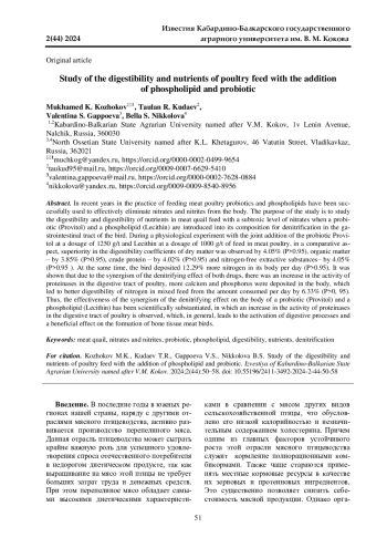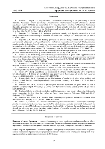 12. Темираев Р. Б., Баева А. А., Кокаева М. Г. Повышение качества мяса кур-бройлеров // Мясная индустрия. 2009. № 6. С. 25-27. EDN: MSOAMN 13. Фомин А. И., Аврутина А. Я. Методика определения переваримости кормов и скорости прохождения пищи по пищеварительному тракту с помощью окиси хрома // Методики научных исследований по кормлению с.-х. птицы. Москва. 1967. С. 21-25.
