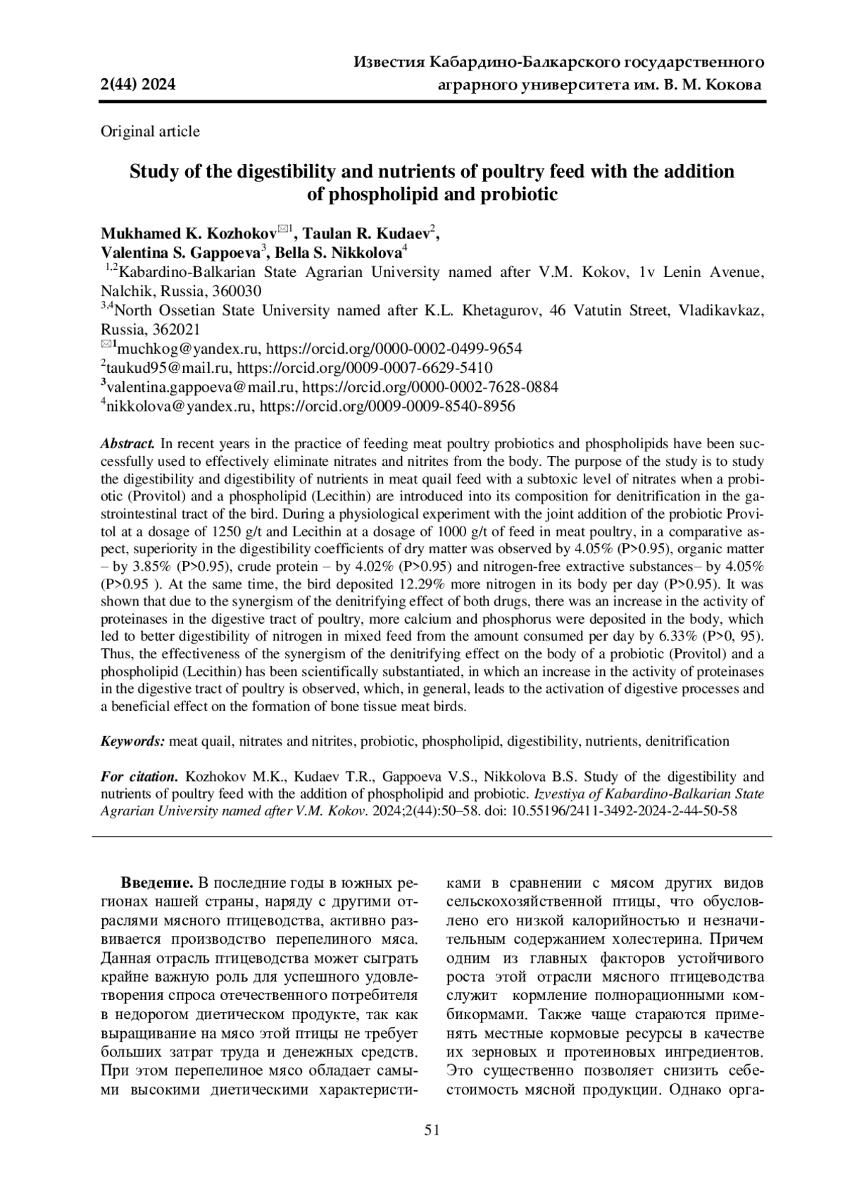 10. Результаты физиологического обменного опыта на перепелах при скармливании пробиотика и фосфолипида / Р. Б. Темираев, С. Г. Козырев, М. Н. Мамукаев, В. С. Гаппоева, Ч. Р. Гайтов, М. С. Газзаева // Известия Горского государственного аграрного университета. 2020. Т. 57. № 4. С. 69-75. EDN: MANTVG