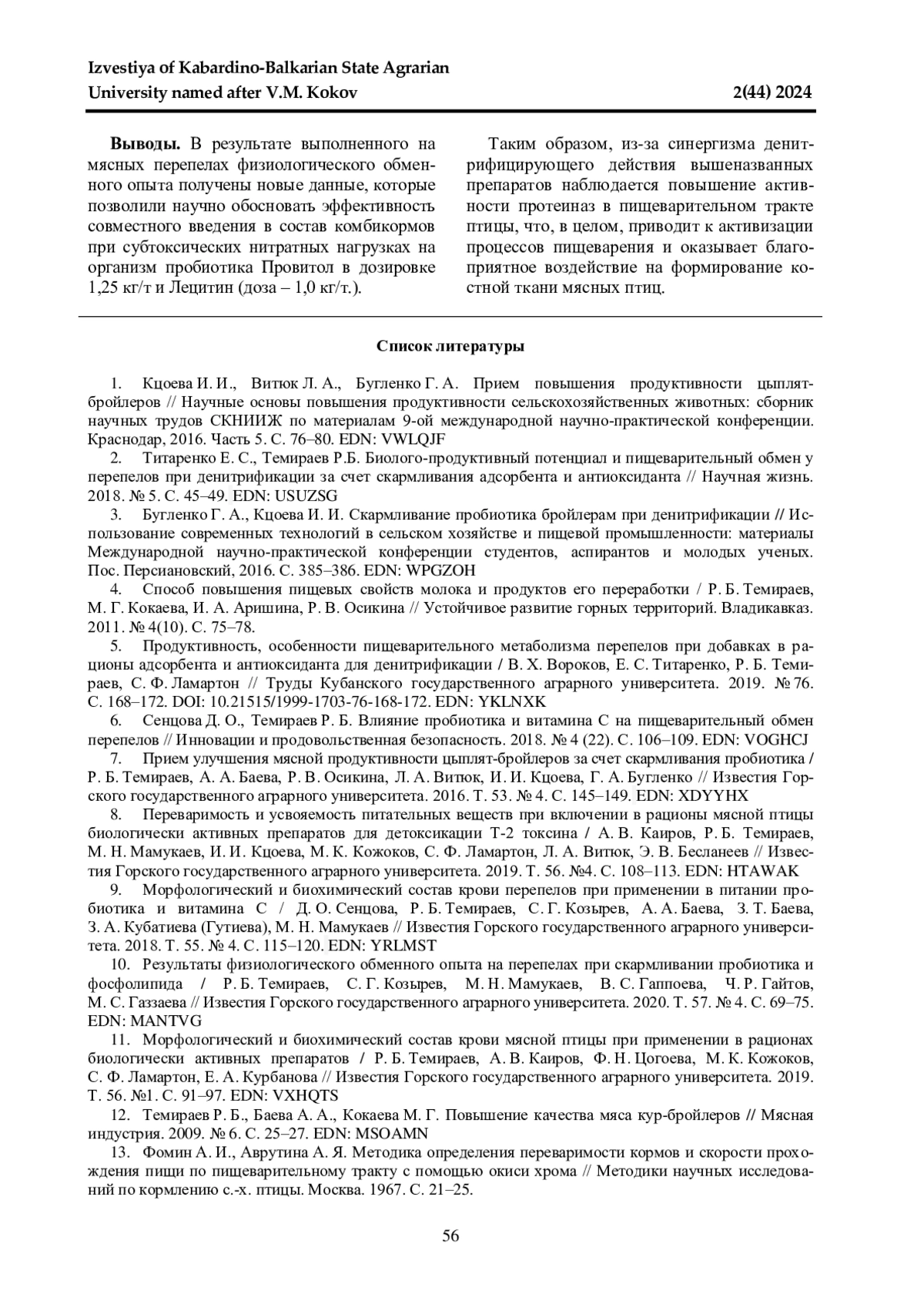 5. Продуктивность, особенности пищеварительного метаболизма перепелов при добавках в рационы адсорбента и антиоксиданта для денитрификации / В. Х. Вороков, Е. С. Титаренко, Р. Б. Темираев, С. Ф. Ламартон // Труды Кубанского государственного аграрного университета. 2019. № 76. С. 168-172. DOI: 10.21515/1999-1703-76-168-172 EDN: YKLNXK