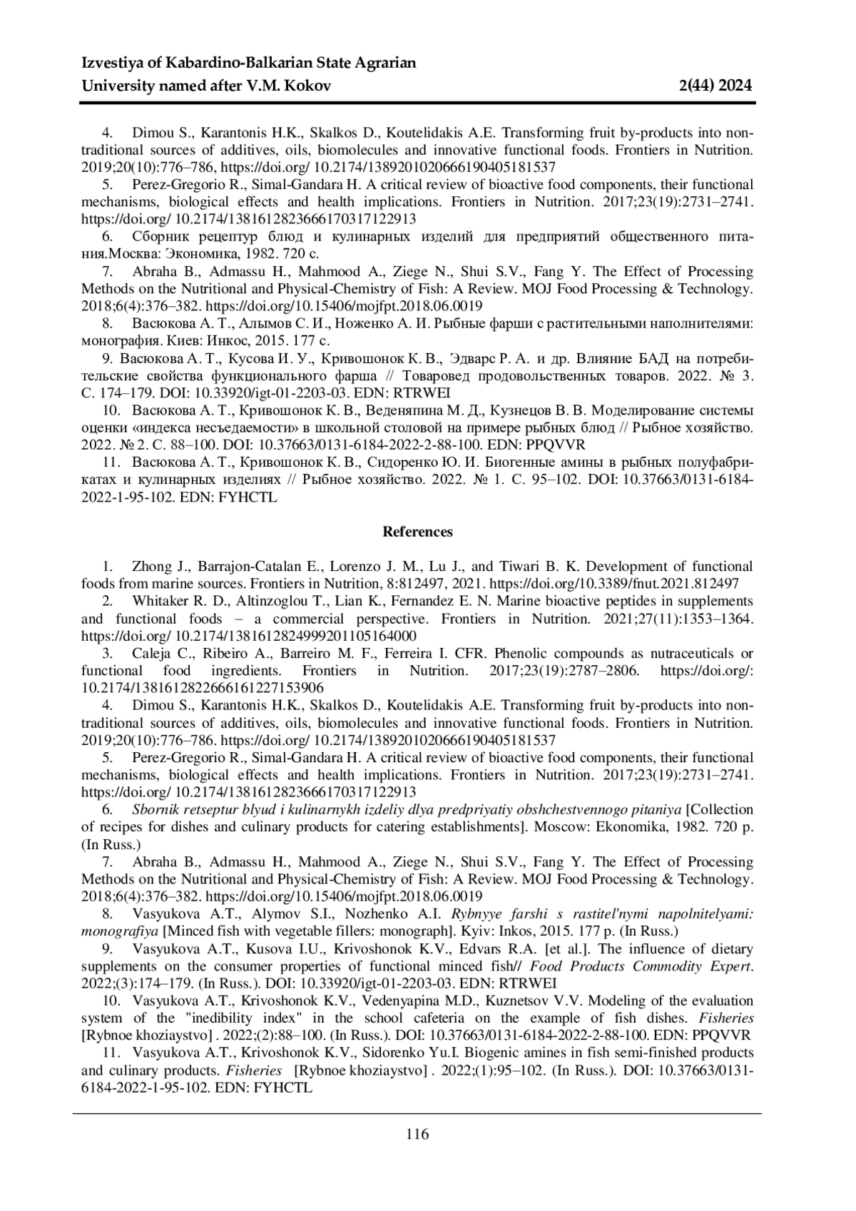 11. 	Васюкова А. Т., Кривошонок К. В., Сидоренко Ю. И. Биогенные амины в рыбных полуфабрикатах и кулинарных изделиях // Рыбное хозяйство. 2022. № 1. С. 95-102. 10.37663/0131-6184- 2022-1-95-102. DOI: 10.37663/0131-6184-2022-1-95-102 EDN: FYHCTL