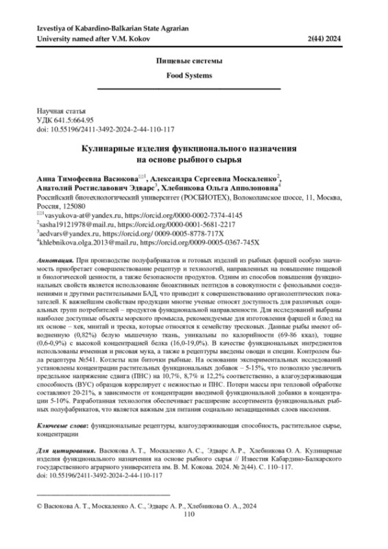 При производстве полуфабрикатов и готовых изделий из рыбных фаршей особую значимость приобретает совершенствование рецептур и технологий, направленных на повышение пищевой и биологической ценности, а также безопасности продуктов. Одним из способов повышения функциональных свойств является использование биоактивных пептидов в совокупности с фенольными соединениями и другими растительными БАД, что приводит к совершенствованию органолептических показателей. К важнейшим свойствам продукции многие ученые относят доступность для различных социальных групп потребителей - продуктов функциональной направленности. Для исследований выбраны наиболее доступные объекты морского промысла, рекомендуемые для изготовления фаршей и блюд на их основе - хек, минтай и треска, которые относятся к семейству тресковых. Данные рыбы имеют обводненную (0,82%) белую мышечную ткань, уникальны по калорийности (69-86 ккал), тощие (0,6-0,9%) с высокой концентрацией белка (16,0-19,0%). В качестве функциональных ингредиентов использованы ячменная и рисовая мука, а также в рецептуры введены овощи и специи. Контролем была рецептура №541. Котлеты или биточки рыбные. На основании экспериментальных исследований установлены концентрации растительных функциональных добавок - 5-15%, что позволило увеличить предельное напряжение сдвига (ПНС) на 10,7%, 8,7% и 12,2% соответственно, а влагоудерживающая способность (ВУС) образцов коррелирует с нежностью и ПНС. Потери массы при тепловой обработке составляют 20-21%, в зависимости от концентрации вводимой функциональной добавки в концентрации 5-10%. Разработанная технология обеспечивает расширение ассортимента функциональных рыбных полуфабрикатов, что является важным для питания социально незащищенных слоев населения.