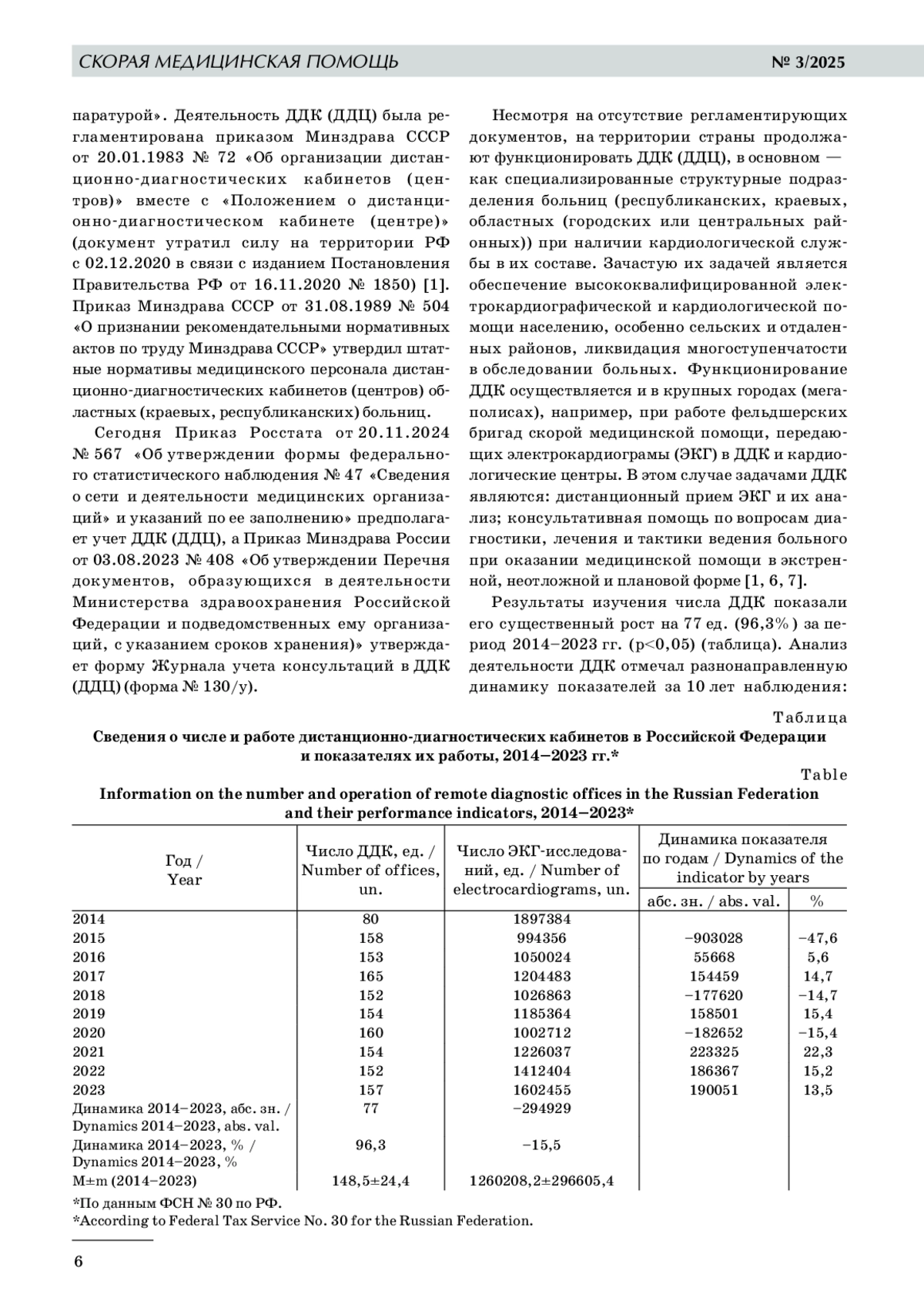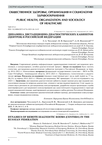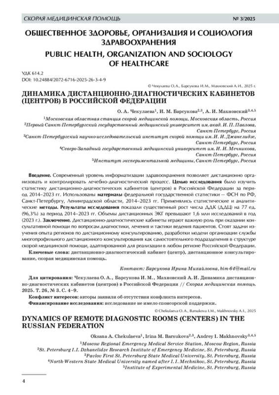 Современный уровень информатизации здравоохранения позволяет дистанционно организовать и контролировать лечебно- диагностический процесс. Целью исследования было изучить статистику дистанционно- диагностических кабинетов (центров) в Российской Федерации за период 2014–2023 гг. Использованы материалы федеральной государственной статистики — ФСН по РФ, Санкт- Петербургу, Ленинградской области, 2014–2023 гг. Применялись статистические и аналитические методы. Результаты исследования показали существенный рост числа ДДК (ДДЦ) на 77 ед. (96,3%) за период 2014–2023 гг. Объемы дистанционных ЭКГ превышают 1,6 млн исследований в год (2023 г.). Заключение. Дистанционно- диагностические кабинеты играют важную роль при оказании консультативной помощи по вопросам диагностики, лечения и тактики ведения пациентов. Стоят задачи изучения опыта регионов по дистанционному консультированию, разработки модели организации службы многопрофильного дистанционного консультирования как самостоятельного подразделения в структуре скорой медицинской помощи, адаптированной для реализации в любом регионе Российской Федерации.