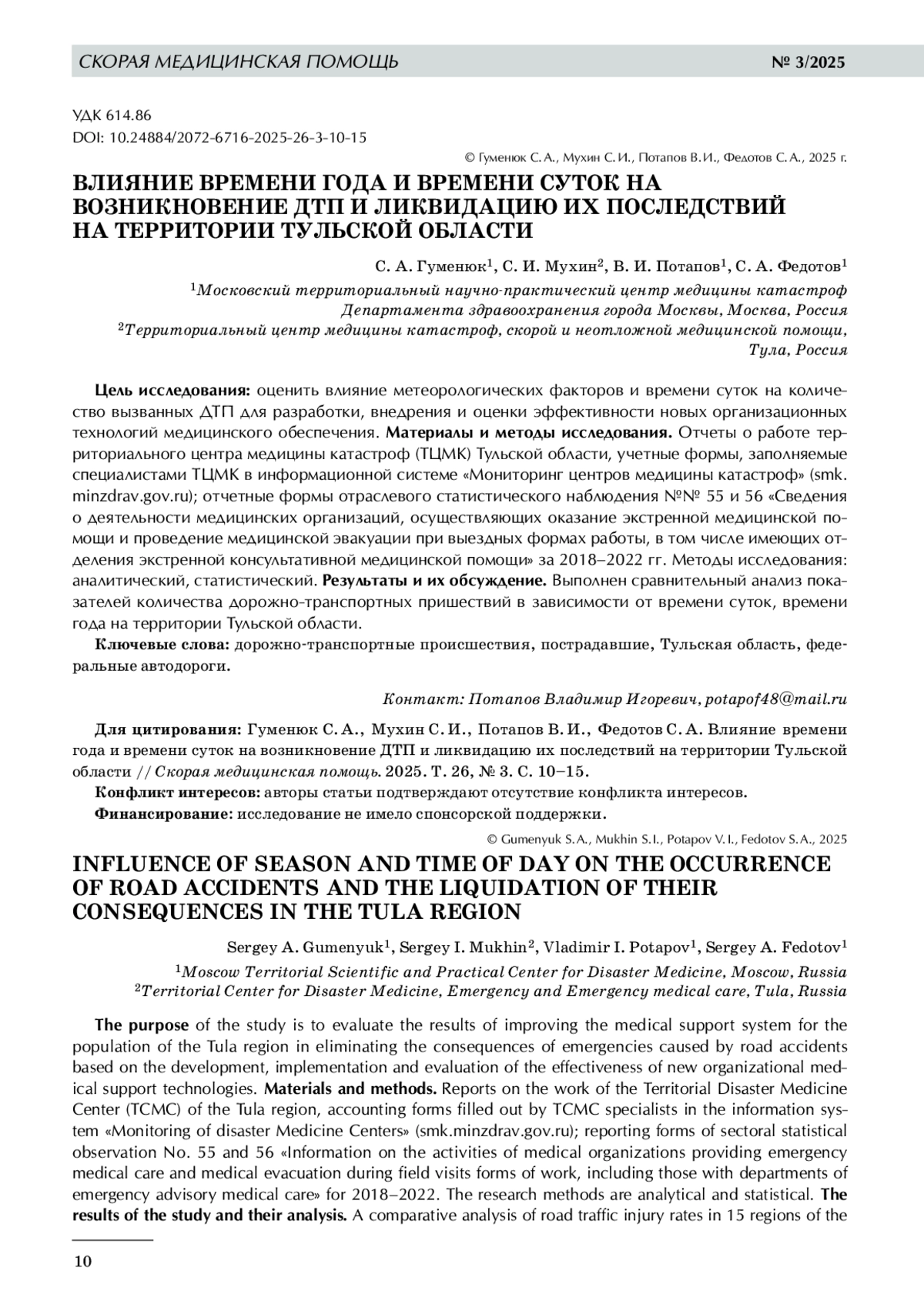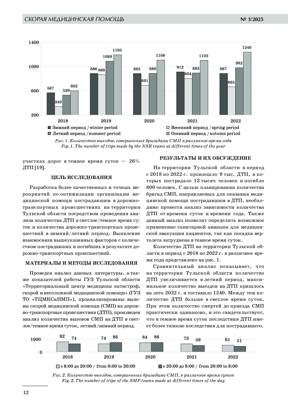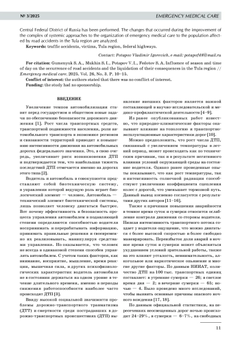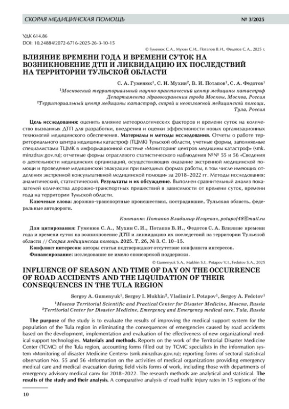 Цель исследования: оценить влияние метеорологических факторов и времени суток на количество вызванных ДТП для разработки, внедрения и оценки эффективности новых организационных технологий медицинского обеспечения. Материалы и методы исследования. Отчеты о работе территориального центра медицины катастроф (ТЦМК) Тульской области, учетные формы, заполняемые специалистами ТЦМК в информационной системе «Мониторинг центров медицины катастроф» (smk. minzdrav. gov. ru); отчетные формы отраслевого статистического наблюдения №№ 55 и 56 «Сведения о деятельности медицинских организаций, осуществляющих оказание экстренной медицинской помощи и проведение медицинской эвакуации при выездных формах работы, в том числе имеющих отделения экстренной консультативной медицинской помощи» за 2018–2022 гг. Методы исследования: аналитический, статистический. Результаты и их обсуждение. Выполнен сравнительный анализ показателей количества дорожно- транспортных пришествий в зависимости от времени суток, времени года на территории Тульской области.