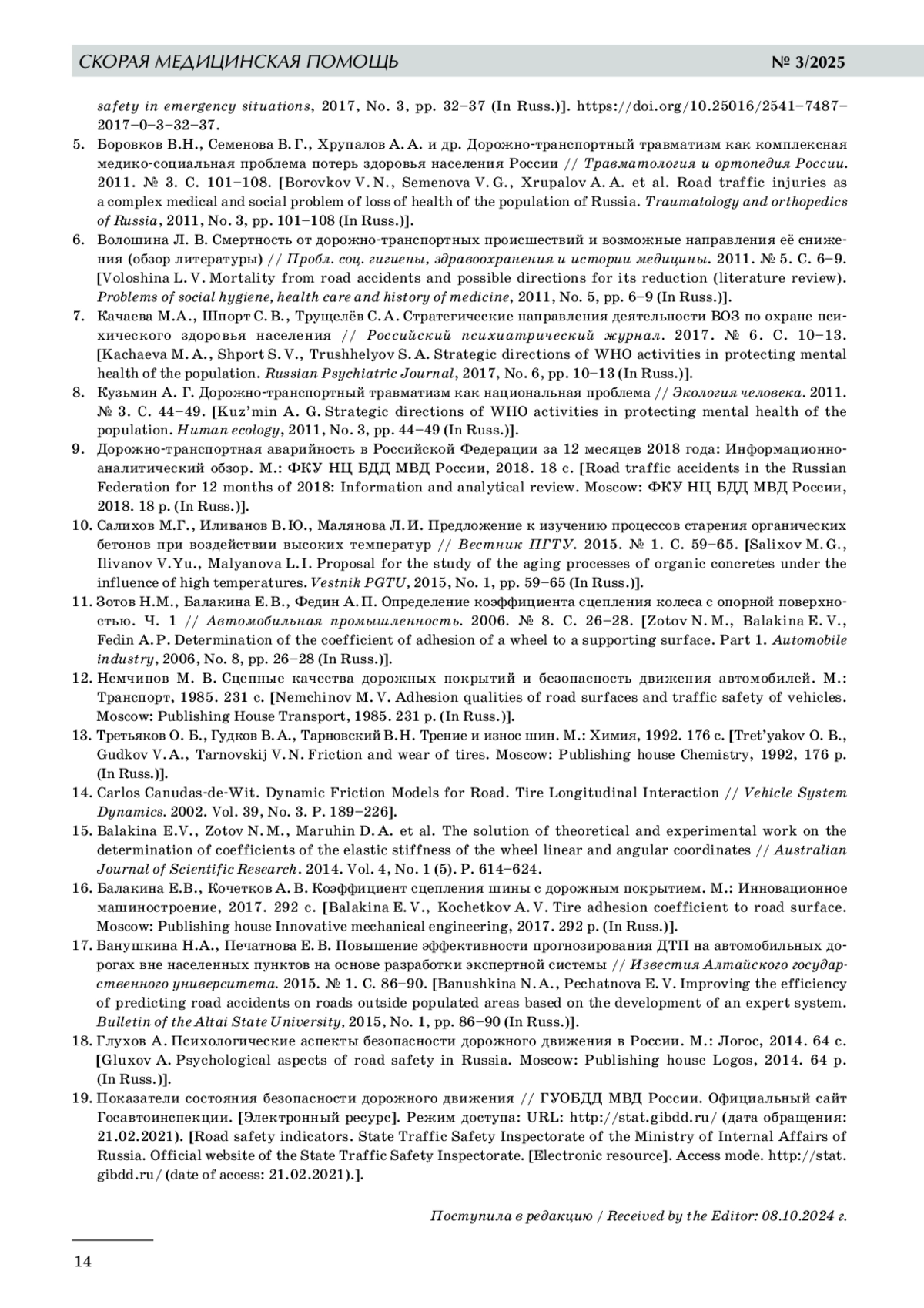 8. Кузьмин А. Г. Дорожно-транспортный травматизм как национальная проблема // Экология человека. 2011. № 3. С. 44-49.