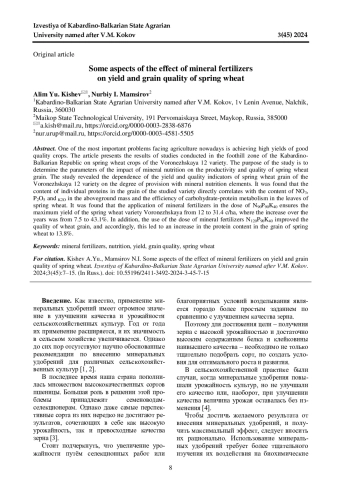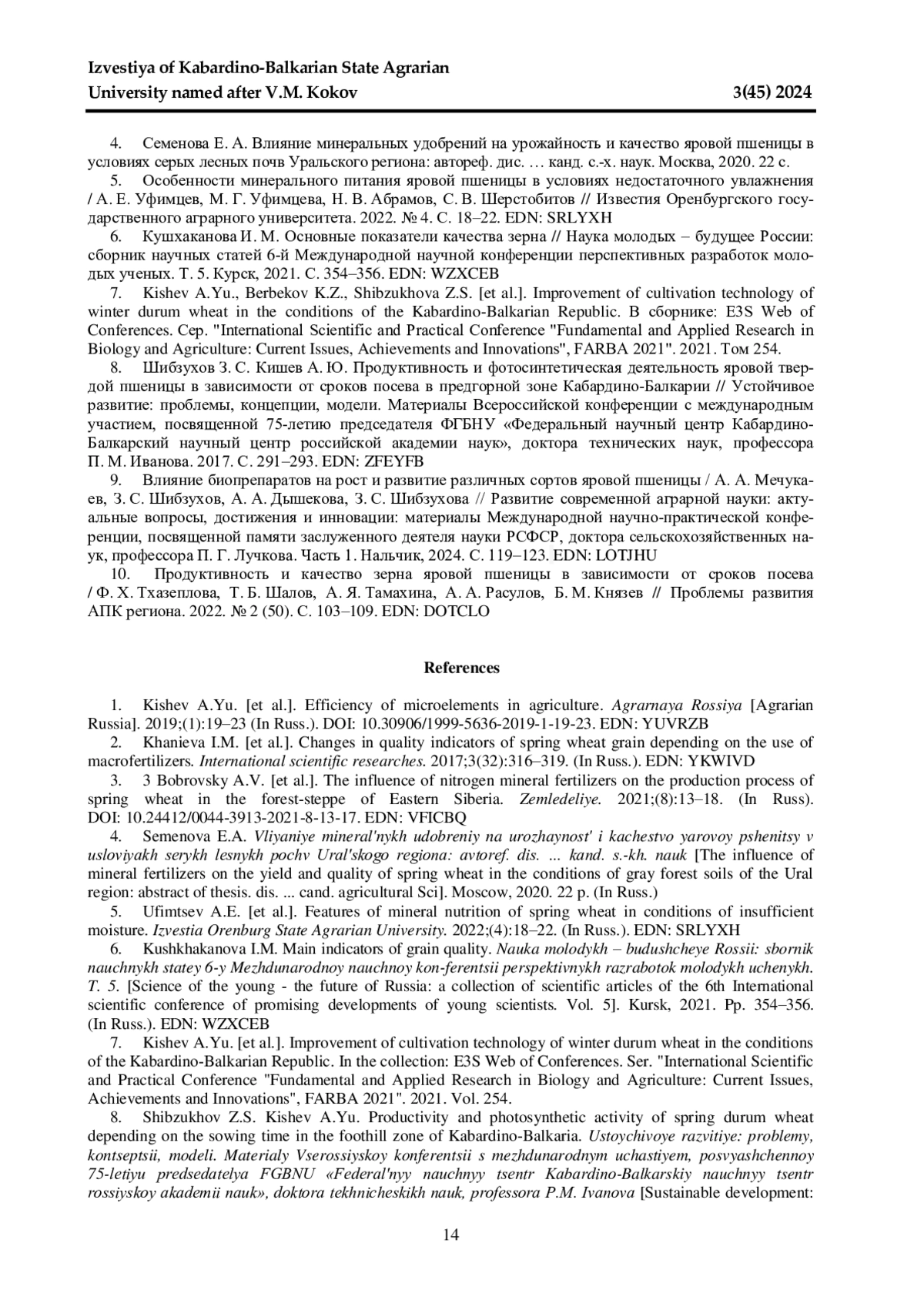 2. 	Изменения показателей качества зерна яровой пшеницы в зависимости от применения макроудобрений / И. М. Ханиева, З. С. Шибзухов, А. Ю. Кишев, Р. А. Гажева, Т. Б. Жеруков // Международные научные исследования. 2017. № 3(32). С. 316-319. EDN: YKWIVD