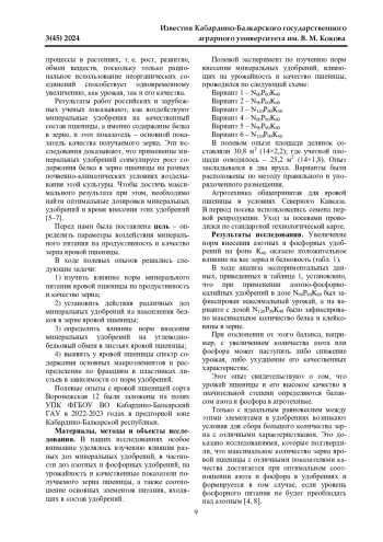 5. 	Особенности минерального питания яровой пшеницы в условиях недостаточного увлажнения / А. Е. Уфимцев, М. Г. Уфимцева, Н. В. Абрамов, С. В. Шерстобитов // Известия Оренбургского государственного аграрного университета. 2022. № 4. С. 18-22. EDN: SRLYXH