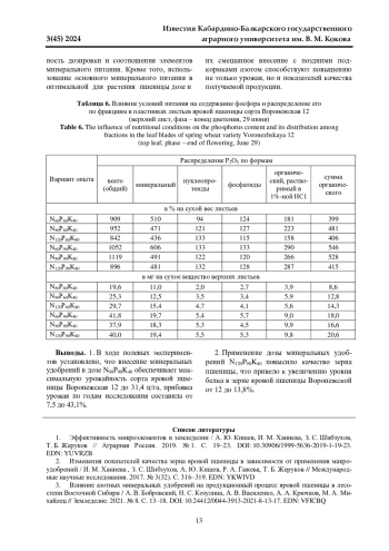 Одна из наиболее важных проблем, которая стоит в настоящее время перед сельским хозяйством, это достижение высокой урожайности сельскохозяйственных культур хорошего качества. В статье приведены результаты исследований, проведенных в предгорной зоне Кабардино-Балкарской республики на посевах яровой пшеницы сорта Воронежская 12. Цель исследования - определить параметры воздействия минерального питания на продуктивность и качество зерна яровой пшеницы. В ходе проведенного исследования выявлена зависимость урожайности и качественных показателей зерна яровой пшеницы сорта Воронежская 12 от степени обеспеченности элементами минерального питания. Установлено, что содержание отдельных белков в зерне исследуемого сорта напрямую коррелирует с содержанием NО3, Р2О5 и K2О в надземной массе и зависит от эффективности протекания углеводно-белкового обмена в листьях яровой пшеницы. Выявлено, что внесение минеральных удобрений в дозе N90Р90K40 обеспечивает максимальный рост урожайности сорта яровой пшеницы Воронежская с 12 до 31,4 ц/га, где прибавка по годам составляла от 7,5 до 43,1%. Кроме того, применение дозы минеральных удобрений N120P90K40 повысило качество зерна пшеницы, и соответственно, это привело к увеличению содержания белка в зерне яровой пшеницы до 13,8%.