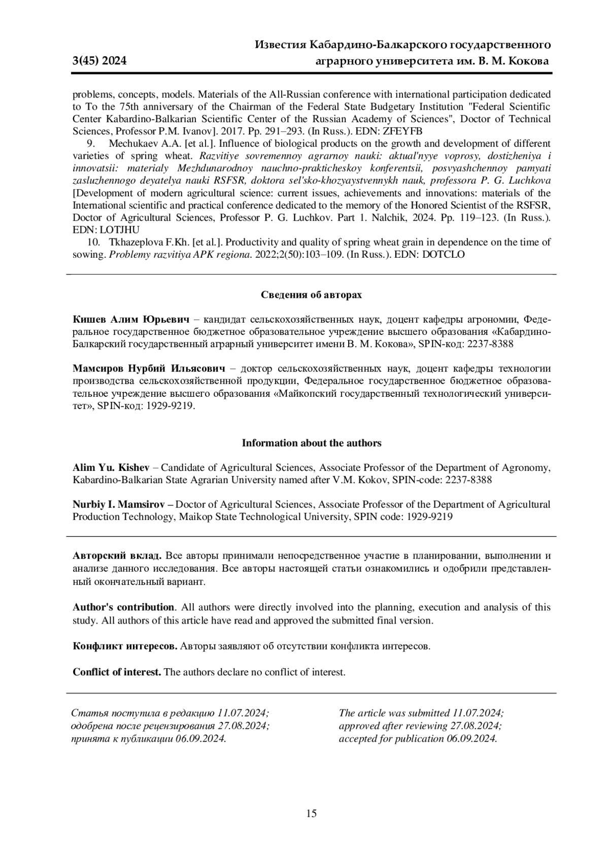 10. 	Продуктивность и качество зерна яровой пшеницы в зависимости от сроков посева / Ф. Х. Тхазеплова, Т. Б. Шалов, А. Я. Тамахина, А. А. Расулов, Б. М. Князев // Проблемы развития АПК региона. 2022. № 2 (50). С. 103-109. EDN: DOTCLO