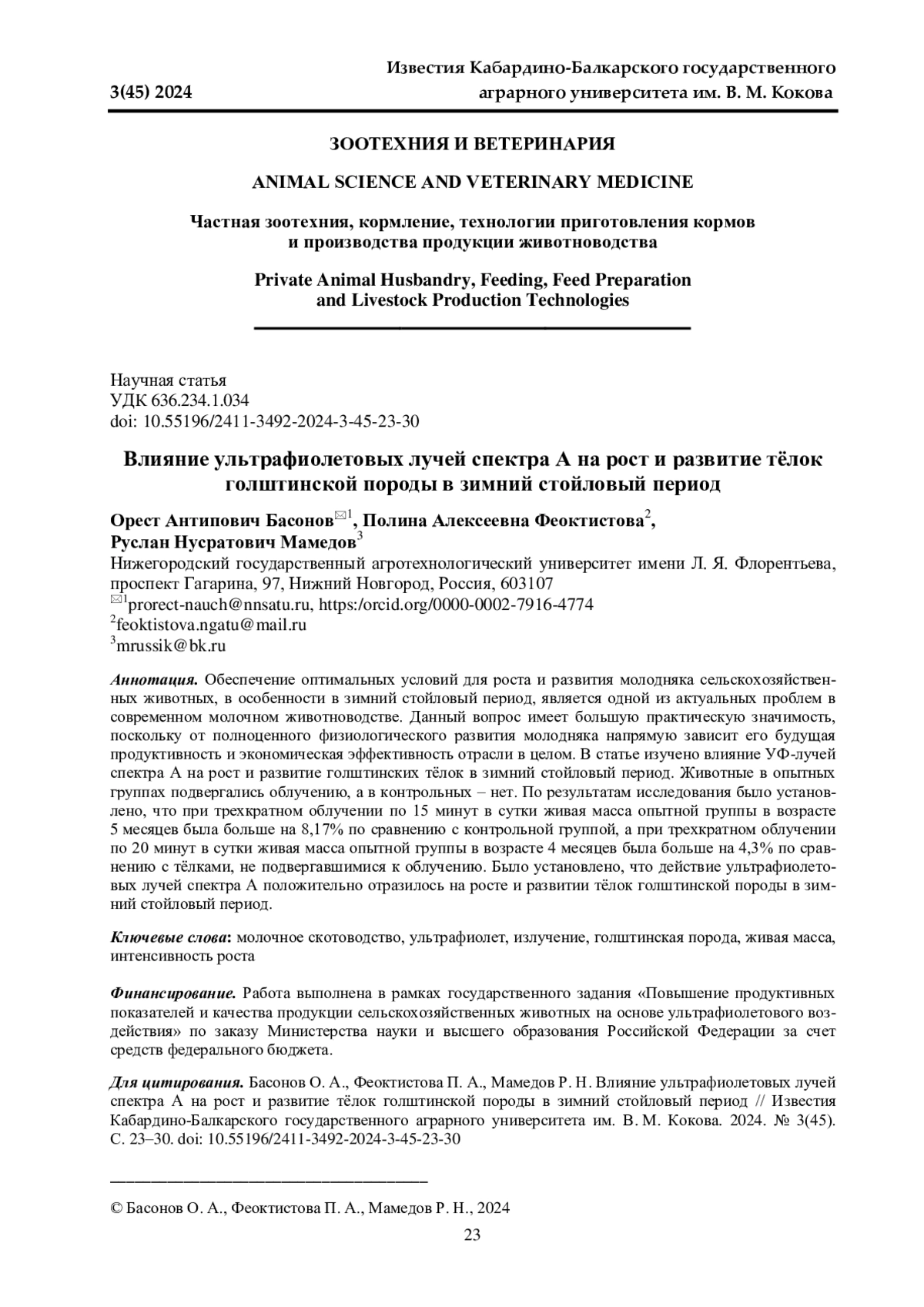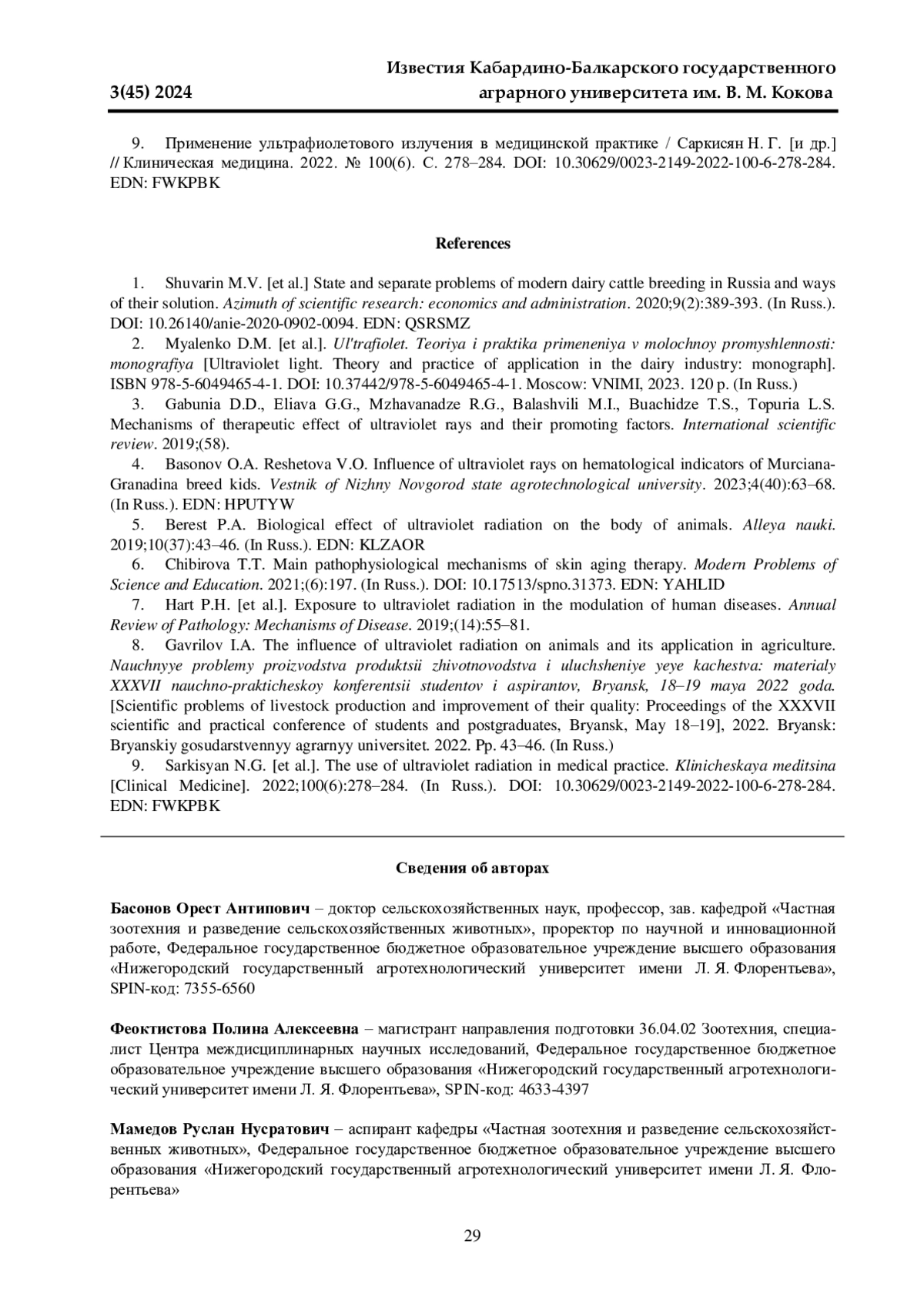 4. Басонов О. А., Решетова В. О. Влияние ультрафиолетовых лучей на гематологические показатели козлят породы Мурсиана-Гранадина // Вестник Нижегородского государственного агротехнологического университета. 2023. № 4(40). С. 63-68. EDN: HPUTYW