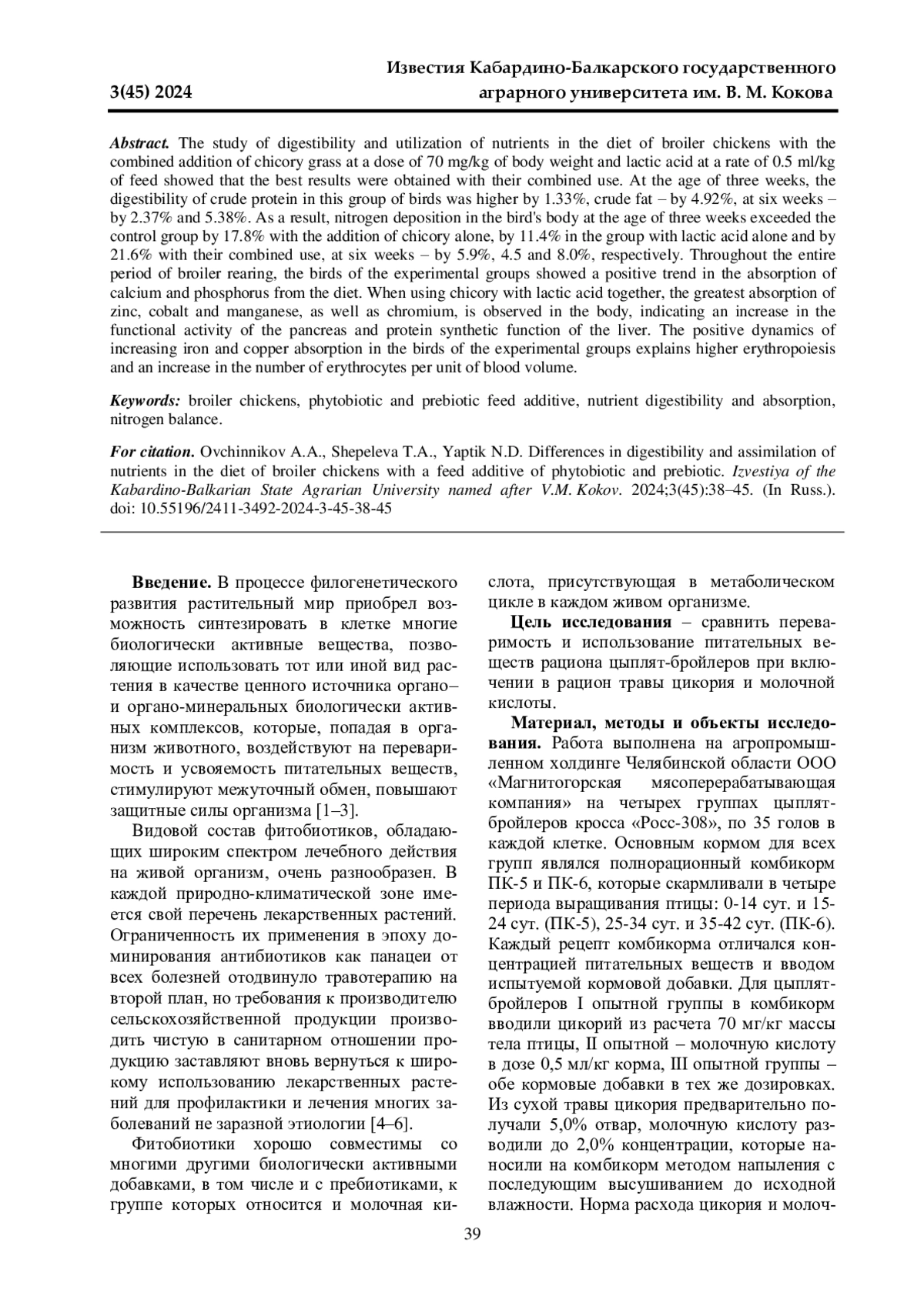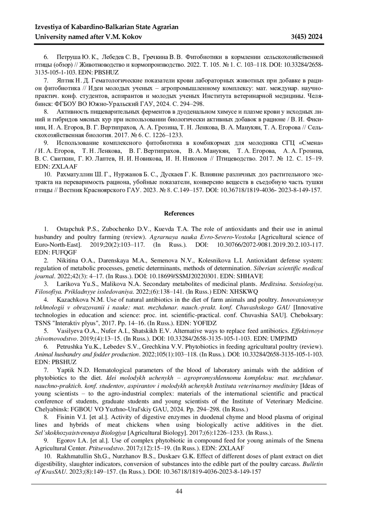 10. Рахматуллин Ш. Г., Нуржанов Б. С., Дускаев Г. К. Влияние различных доз растительного экстракта на переваримость рациона, убойные показатели, конверсию веществ в съедобную часть тушки птицы // Вестник Красноярского ГАУ. 2023. № 8. С.149-157. 10.36718/1819-4036- 2023-8-149-157. DOI: 10.36718/1819-4036-2023-8-149-157 EDN: PSXDBT
