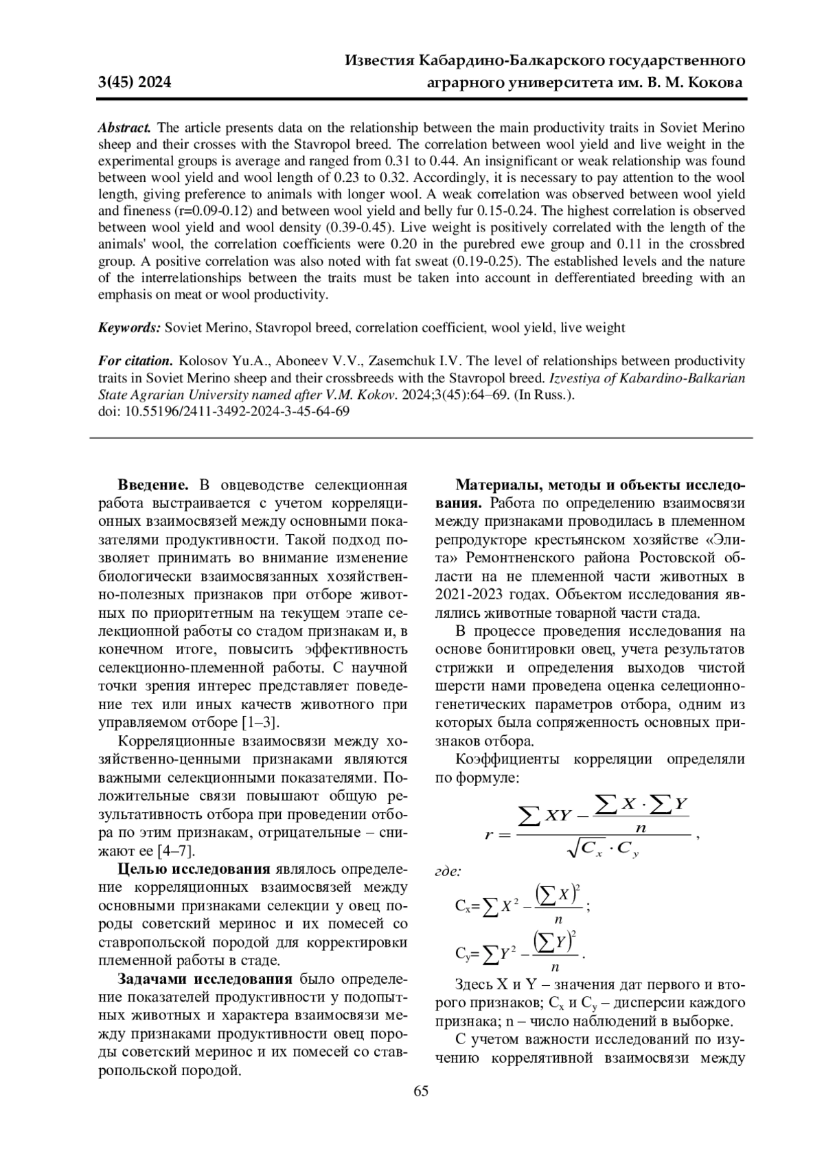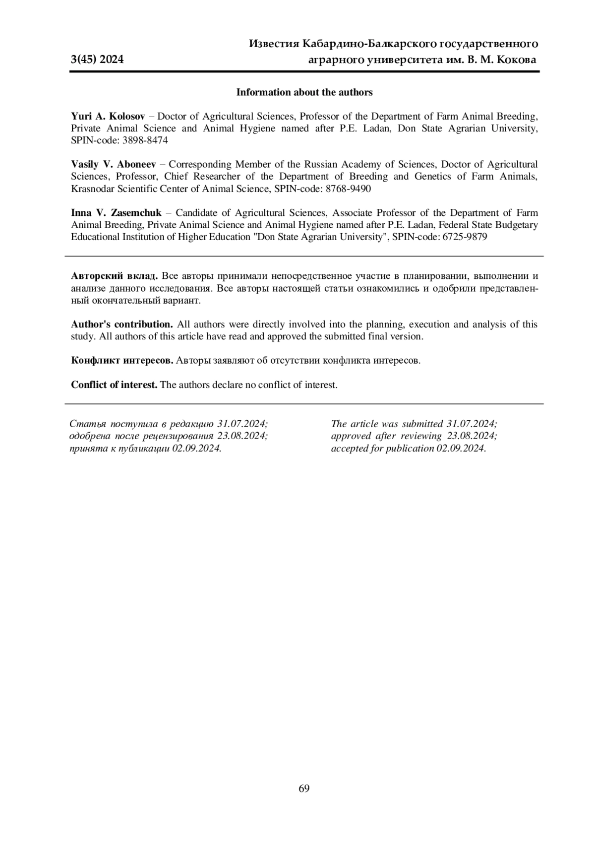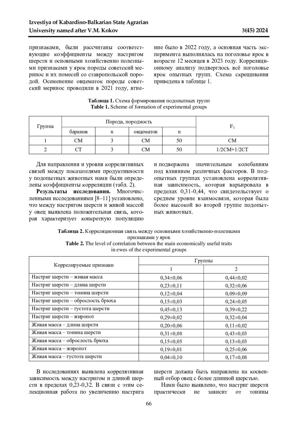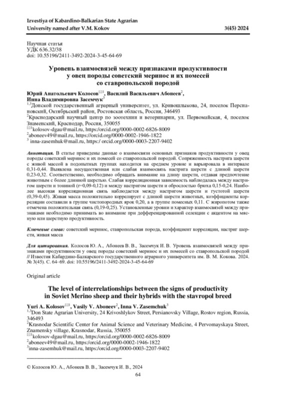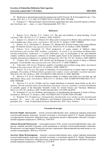 7. Характер наследования шерстной продуктивности у мериносовых овец улучшенных генотипов / Ю. А. Колосов [и др.] // Известия Нижневолжского агроуниверситетского комплекса: Наука и высшее профессиональное образование. 2024. № 2(74). С. 194-201. DOI: 10.32786/2071-9485-2024-02-23 EDN: RKIANH