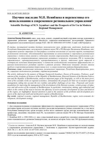 В статье, посвященной памяти доктора экономических наук, профессора, академика Академии наук Республики Башкортостан, заслуженного деятеля науки РФ и РБ Мазгара Насиповича Исянбаева, анализируются важные страницы его биографии и основные положения его научных трудов, посвященных региональной экономике, обосновываются перспективы их использования в современном региональном управлении с учетом новых реалий и глобальных вызовов современности. Выделены предложения и рекомендации по совершенствованию управления развитием комплексов экономики РФ (в частности, строительного, горнопромышленного, агропромышленного и других), отдельных групп отраслей и подотраслей экономики Башкортостана, в контексте необходимости повышения эффективности социально-экономического развития городов и районов региона. Отдельное внимание уделено анализу проблем и перспектив развития депрессивных юго- и северо-восточных районов Башкортостана