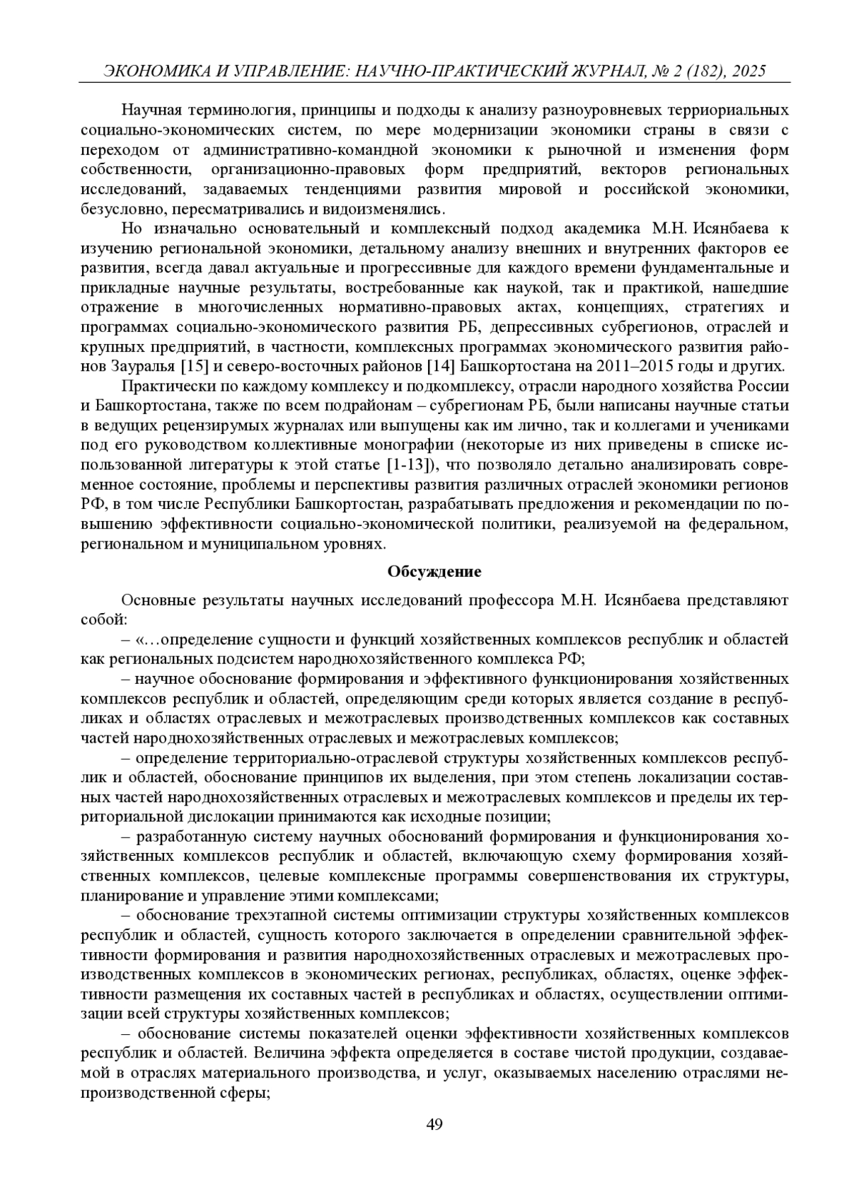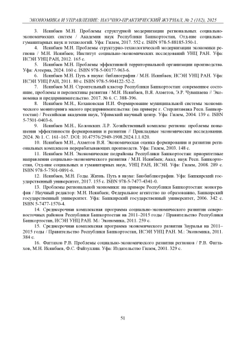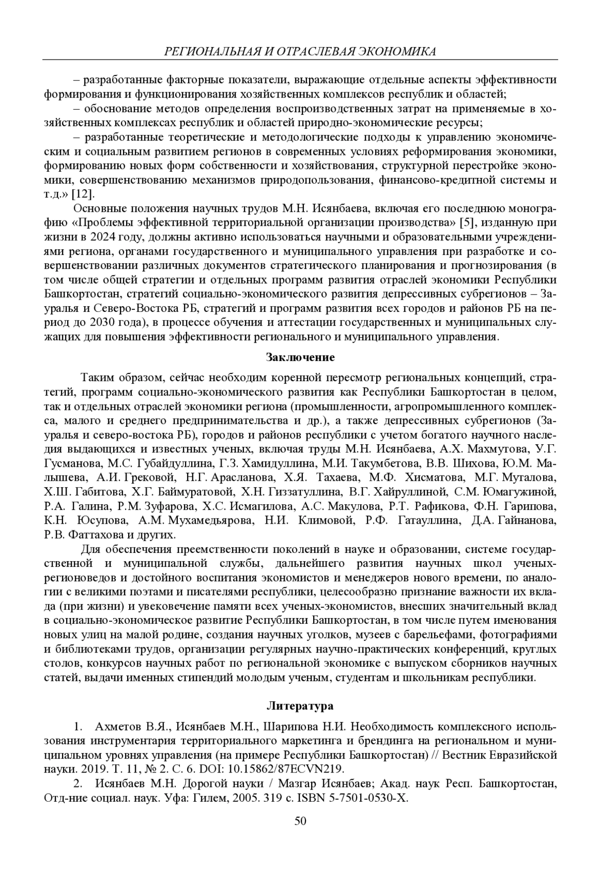 5. 	Исянбаев М.Н. Проблемы эффективной территориальной организации производства. Уфа: Аэтерна, 2024. 160 с.  ISBN: 978-5-00177-963-6