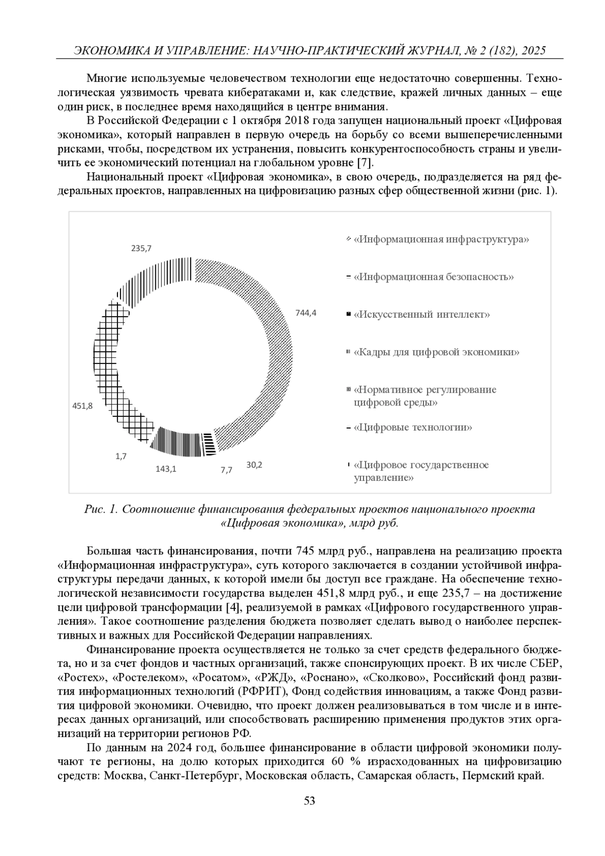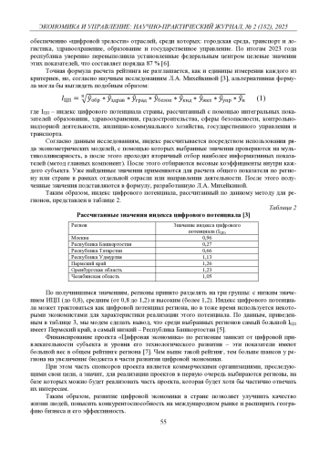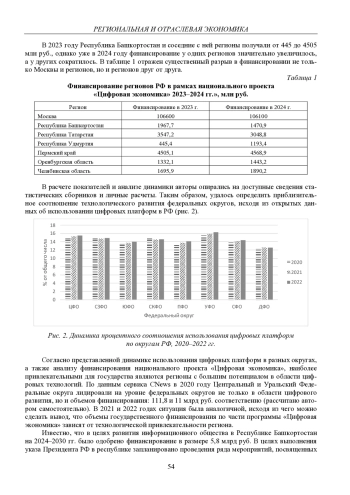 Цель представленного исследования заключается в оценке цифрового потенциала регионов Российской Федерации, основанной на расчете индекса «цифровой зрелости» посредством использования ряда эконометрических моделей, с помощью которых коэффициенты проверяются на мультиколлинеарность. Проанализированы тенденции цифрового развития регионов, приведена сравнительная характеристика объемов финансирования регионов в соответствии с национальным проектом «Цифровая экономика», представлена динамика процентного соотношения использования цифровых платформ по округам РФ.