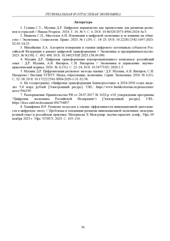 5. 	Мусина Д.Р. Цифровизация регионов: методы оценки / Д.Р. Мусина, А.В. Янгиров, С.И. Насырова // Вестник УГНТУ. Наука, образование, экономика. Серия: Экономика. 2020. № 1(31). С. 32-38.  DOI: 10.17122/2541-8904-2020-1-31-32-38
