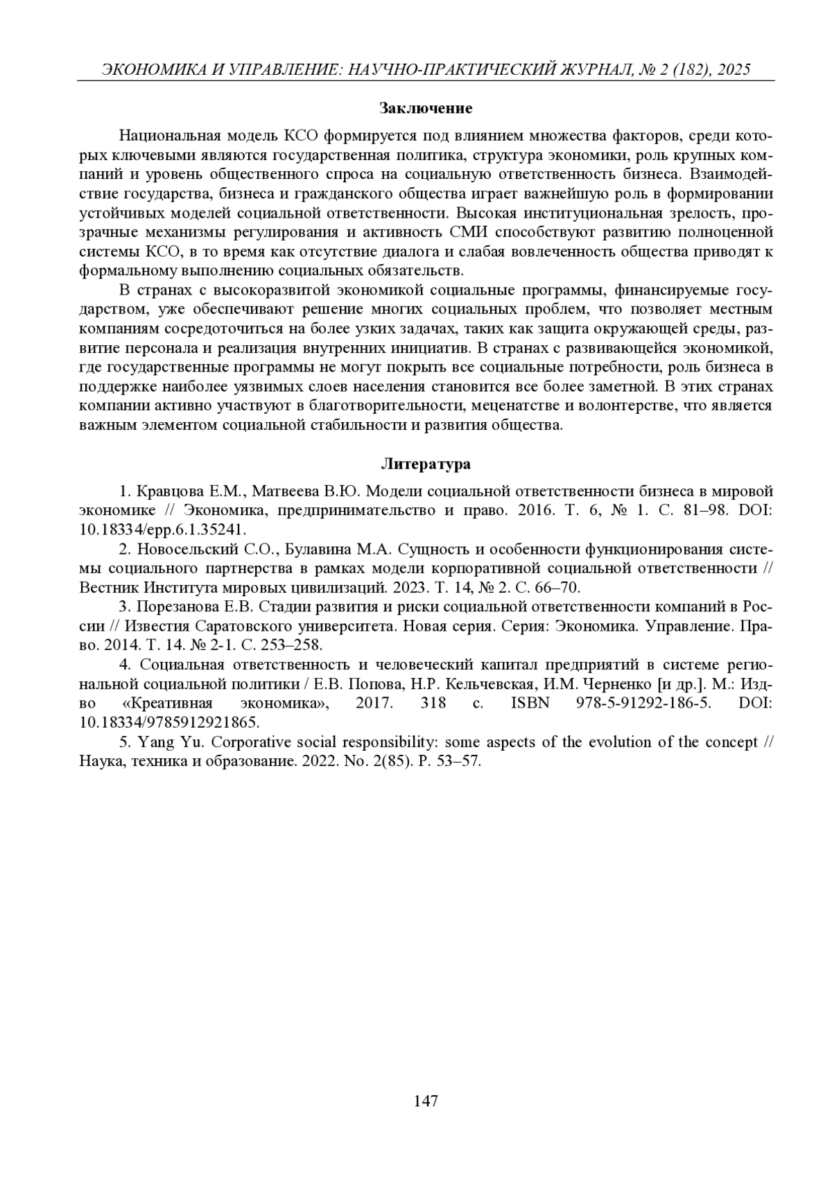 1. 	Кравцова Е.М., Матвеева В.Ю. Модели социальной ответственности бизнеса в мировой экономике // Экономика, предпринимательство и право. 2016. Т. 6, № 1. С. 81-98. DOI: 10.18334/epp.6.1.35241 EDN: WBGMRB