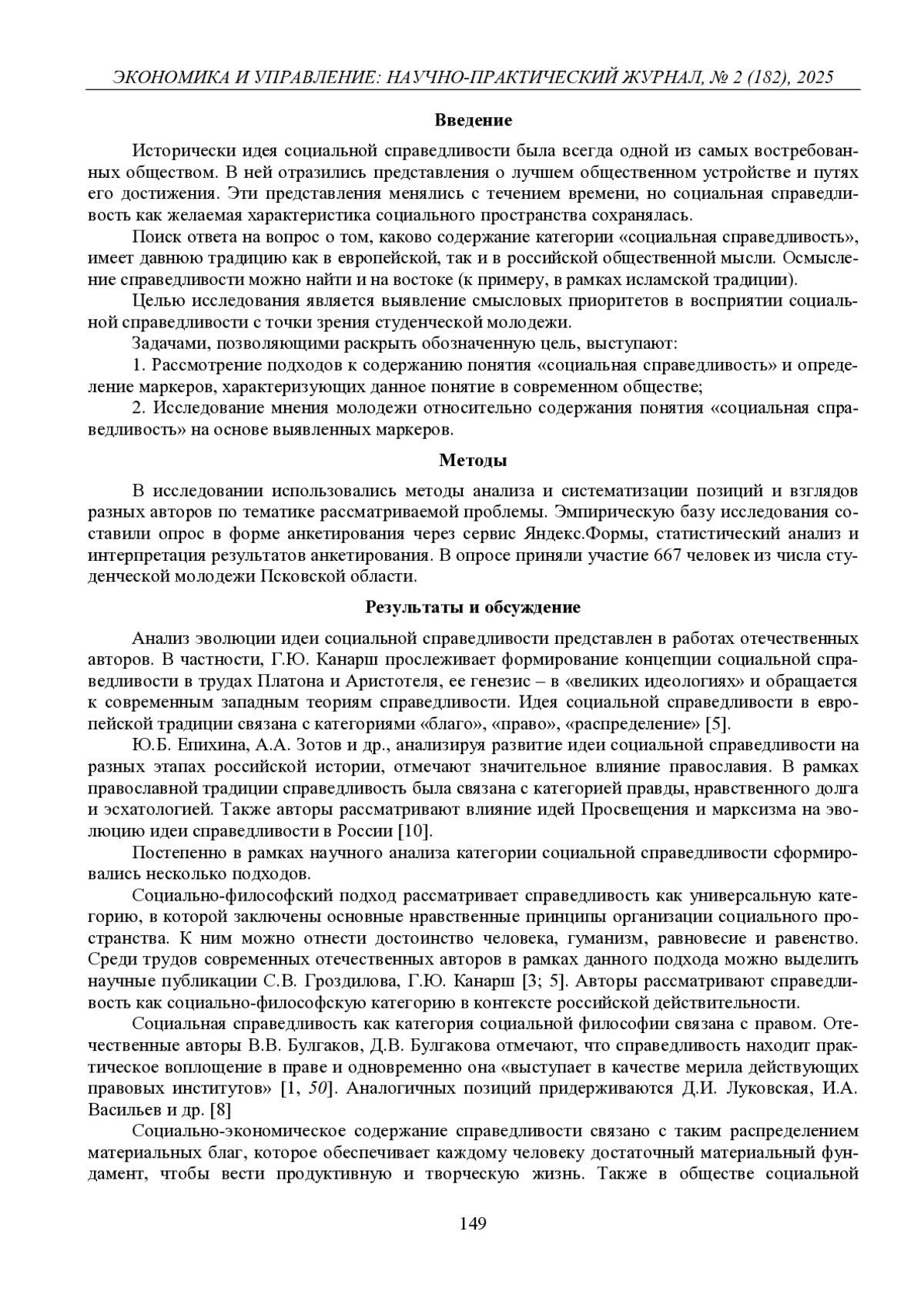 В статье авторами обобщены теоретические подходы к содержанию понятия «социальная справедливость», выделены соответствующие маркеры, ее характеризующие. На основе обозначенных маркеров проведено исследование, целью которого явилось выявление приоритетов в смысловом представлении социальной справедливости студенческой молодежью. Исследование включало опрос студенческой молодежи Псковской области. Опрос проводился путем анкетирования с использованием сервиса Яндекс. Формы. Всего в опросе приняли участие 667 респондентов. Выводы, полученные по результатам проведенного исследования, свидетельствуют о доминировании социально-экономических аспектов в восприятии данной категории молодыми людьми