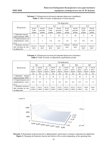 Топливная аппаратура должна обеспечить идентичность топливоподачи во все цилиндры по таким параметрам как цикловая подача, угол начала впрыска топлива, характеристики впрыска. Неидентичность указанных параметров по всем цилиндрам дизельного двигателя является причиной различного характера протекания рабочего процесса в них и, естественно, приводит к различиям индикаторных показателей работы по цилиндрам дизельного двигателя. Износ деталей топливной аппаратуры в процессе эксплуатации, особенно прецизионных элементов топливной системы высокого давления, приводит к изменению их гидравлических характеристик, в результате чего нарушается равномерность процесса впрыскивания топлива по секциям топливного насоса высокого давления. Таким образом, для разработки мероприятий по обеспечению равномерности параметров топливоподачи в процессе ремонтно-обслуживающих работ требуется установить зависимость параметров топливоподачи от изменения технического состояния элементов топливной системы высокого давления с учетом их отклонения от установленных значений техническими условиями. В результате проведенных исследований установлено, что увеличение эффективного проходного сечения на режиме работы дизеля 4Ч11/12,5 от 0,30 мм2 до критической величины, равной 0,40 мм2, вызвало увеличение цикловой подачи топлива на 5,7%; увеличение эффективного проходного сечения от 0,29 до 0,59 мм2 при этом привело к уменьшению давления впрыскивания на 25%, продолжительности впрыскивания на 22,2% и угла запаздывания впрыскивания топлива на 10,0%; увеличение эффективного проходного сечения топливопровода с 0,80 до 1,10 мм2 привело к увеличению цикловой подачи топлива на 1,1%. При этом давление и продолжительность впрыскивания топлива уменьшились, соответственно, на 13,6% и на 12,2%, угол запаздывания впрыскивания топлива практически не изменился.