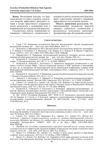 8. 	Lebedev A.T., Lebedev P.A., Apazhev A.K., Egozhev A.M., Bolotokov A.L. Improving the economy of diesel engines with the upgraded sprayer of the injector // Research Journal of Pharmaceutical, Biological and Chemical Sciences. 2018. Vol. 9. № 6. Pp. 737-742. EDN: XFIBOQ