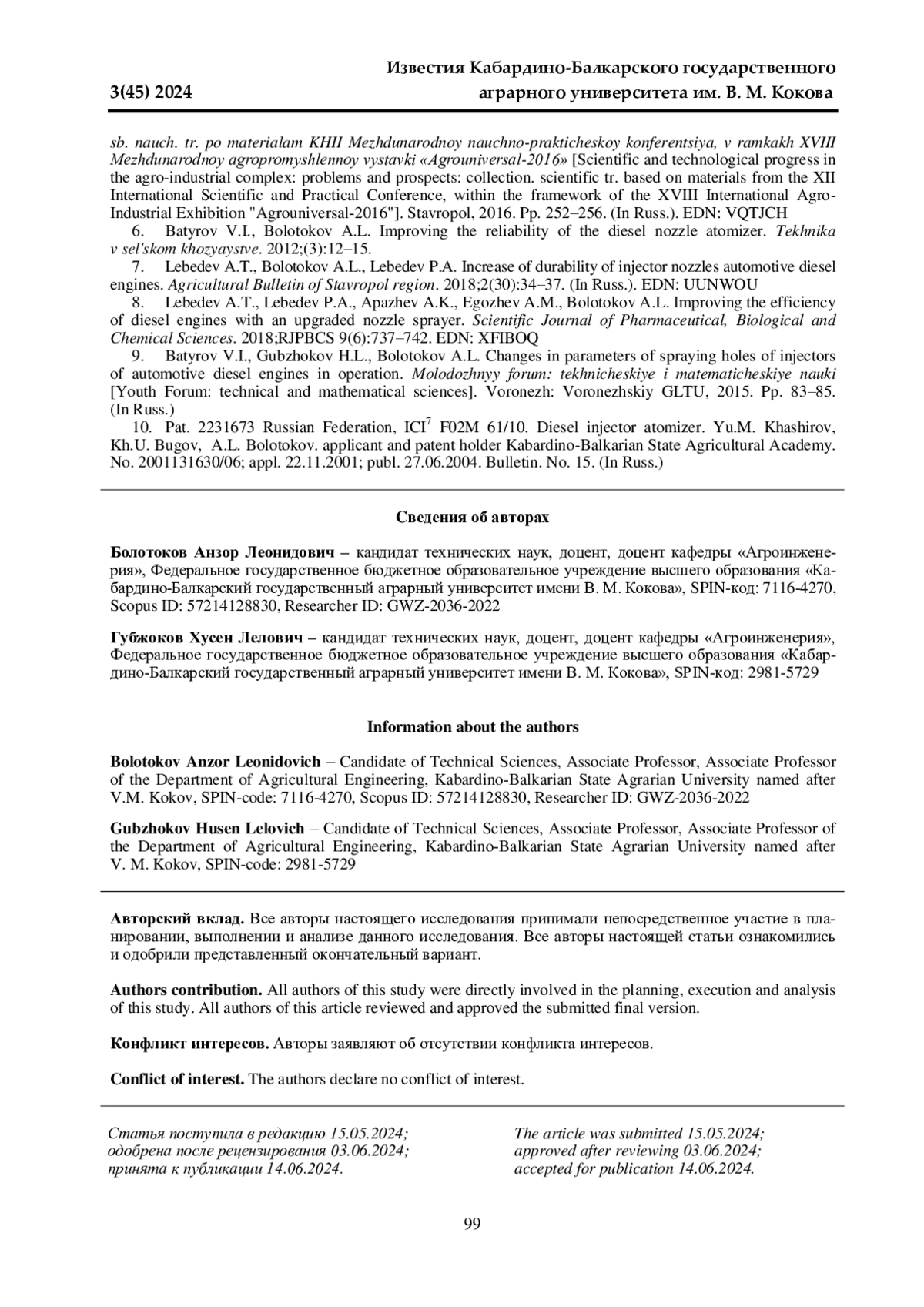9. 	Батыров В. И., Губжоков Х. Л., Болотоков А. Л. Изменения параметров распыливающих отверстий форсунок автотракторных дизелей в эксплуатации // Молодѐжный форум: технические и математические науки. Воронеж: Воронежский ГЛТУ, 2015. С. 83-85.