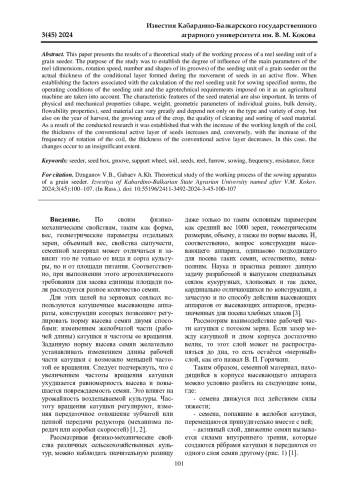 В данной работе приведены результаты теоретического исследования рабочего процесса катушечного высевающего аппарата зерновой сеялки. Целью исследования являлось установление степени влияния основных параметров катушки (размеров, частоты вращения, числа и форм ее желобков) высевающего аппарата зерновой сеялки на действительную толщину условного слоя, формирующегося при движении семян в активном потоке. При установлении факторов, связанных с расчетом катушечного высевающего аппарата на высев заданных норм, учитываются условия работы посевного агрегата и агротехнические требования, предъявляемые к ней как к машине сельскохозяйственного назначения. Важное значение также имеют и характерные особенности посевного материала. По физикомеханическим свойствам (форме, весу, геометрическим параметрам отдельных зерен, объемному весу, свойствам сыпучести) семенной материал может сильно отличаться и зависеть не только от вида и сорта культуры, но и от года сбора урожая, местности произрастания культуры, качества очистки и сортирования семенного материала. В результате проведенного исследования установлено, что с увеличением рабочей длины катушки толщина условного активного слоя семян увеличивается и, наоборот, с увеличением частоты вращения катушки толщина условного активного слоя уменьшается. При этом изменения происходят в незначительной степени.