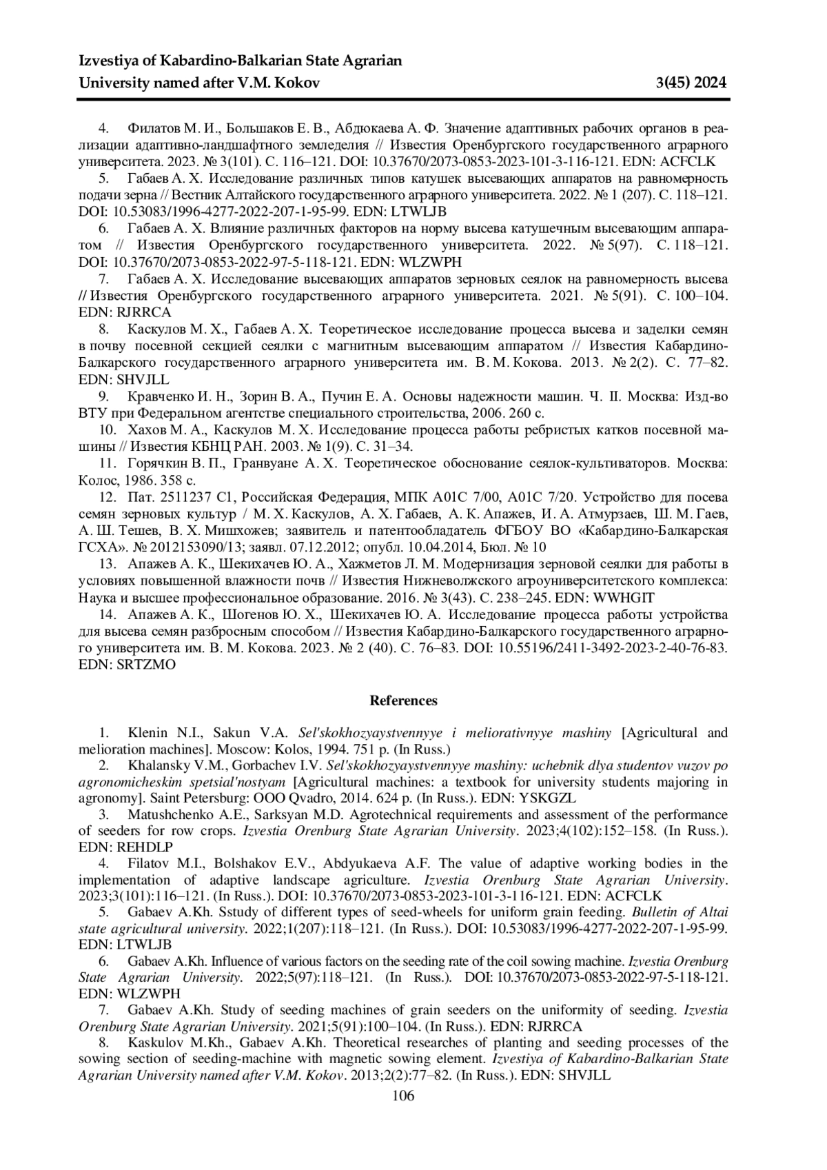 8. Каскулов М. Х., Габаев А. Х. Теоретическое исследование процесса высева и заделки семян в почву посевной секцией сеялки с магнитным высевающим аппаратом // Известия Кабардино-Балкарского государственного аграрного университета им. В. М. Кокова. 2013. № 2(2). С. 77-82. EDN: SHVJLL