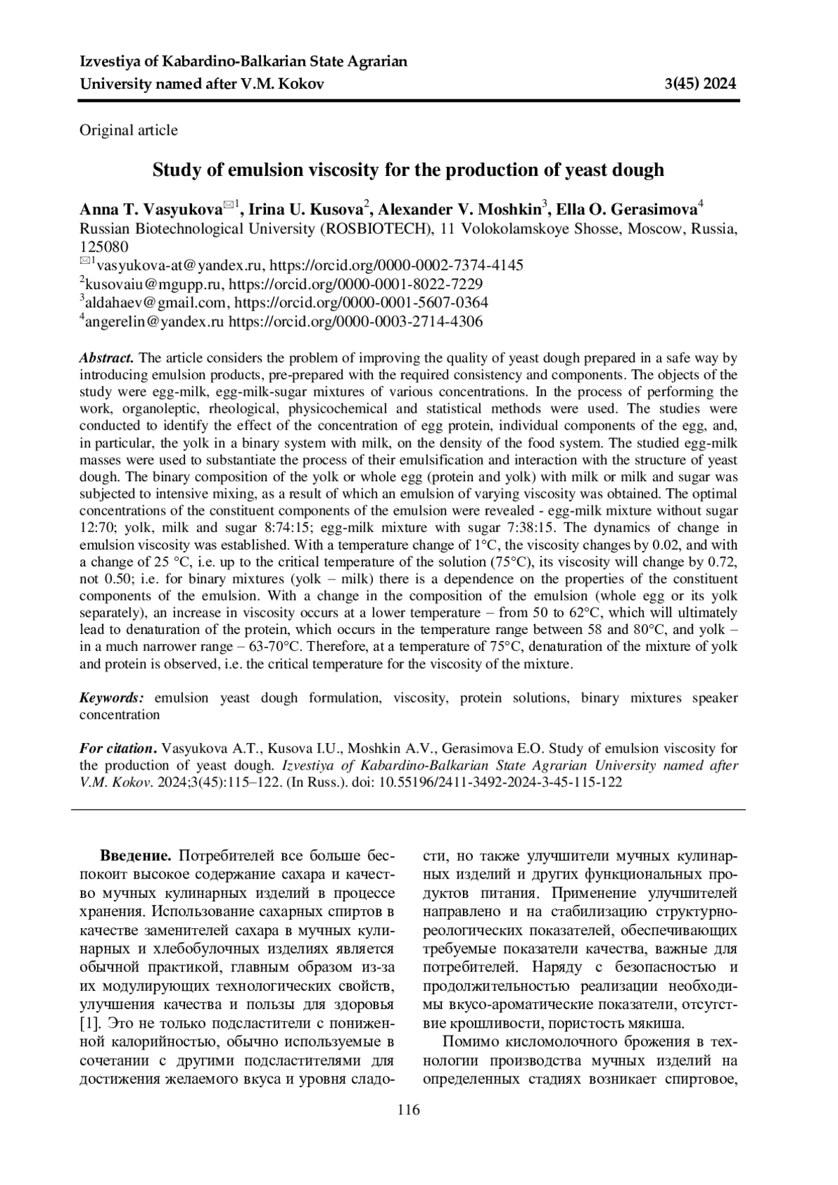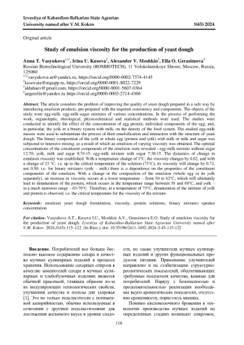 В статье рассмотрена проблема повышения качества дрожжевого теста, приготовленного безопасным способом, путем введения эмульсионных продуктов, предварительно подготовленных нужной консистенции и составных компонентов. Объектами исследования были яично-молочные, яично-молочно-сахарные смеси различной концентрации. В процессе выполнения работы использовались органолептические, реологические, физико-химические и статистические методы. Проведены исследования по выявлению влияния концентрации белка, отдельных составных компонентов яйца и, в частности, желтка в бинарной системе с молоком на плотность пищевой системы. Исследуемые яичномолочные массы были использованы для обоснования процесса их эмульгирования и взаимодействия со структурой дрожжевого теста. Бинарная композиция желтка или целого яйца (белок и желток) с молоком или молоком и сахаром подвергалась интенсивному перемешиванию, в результате чего получена эмульсия различной вязкости. Выявлены оптимальные концентрации составных компонентов эмульсии - яично-молочная смесь без сахара 12:70; желток, молоко и сахар 8:74:15; яично-молочная смесь с сахаром 7:38:15. Установлена динамика изменения вязкости эмульсии. При изменении температуры на 1оС вязкость изменяется на 0,02, а при изменении на 25оС, т. е. до критической температуры раствора (75оС) его вязкость изменится на 0,72, а не 0,50; т. е. для бинарных смесей (желток - молоко) наблюдается зависимость от свойств составных компонентов эмульсии. С изменением состава эмульсии (целое яйцо или отдельно его желток) увеличение вязкости осуществляется уже при более низкой температуре - от 50 до 62оС, что в результате приведет к денатурации белка, которая происходит в интервале температур между 58 и 80оС, а желтка - в гораздо более узком диапазоне - 63-70оС. Поэтому при температуре 75оС наблюдается денатурация смеси желтка и белка, т. е. критическая температура для вязкости смеси.