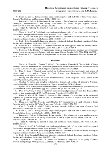 10. 	Bhize S., Kaur A. Baking qualities, organoleptic properties and shelf life of bread with polyols. Journal of Food Science and Technology. 2014;51:2054-2061. EDN: OXNPCF