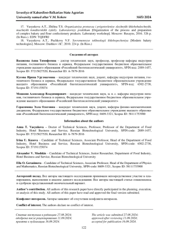 16. 	Васюкова А. Т., Абесадзе Л. Т. Влияние компонентов рецептуры на качество хлебобулочных изделий при хранении // Хлебопродукты. 2008. № 8. С. 50-51. EDN: JUXLVP