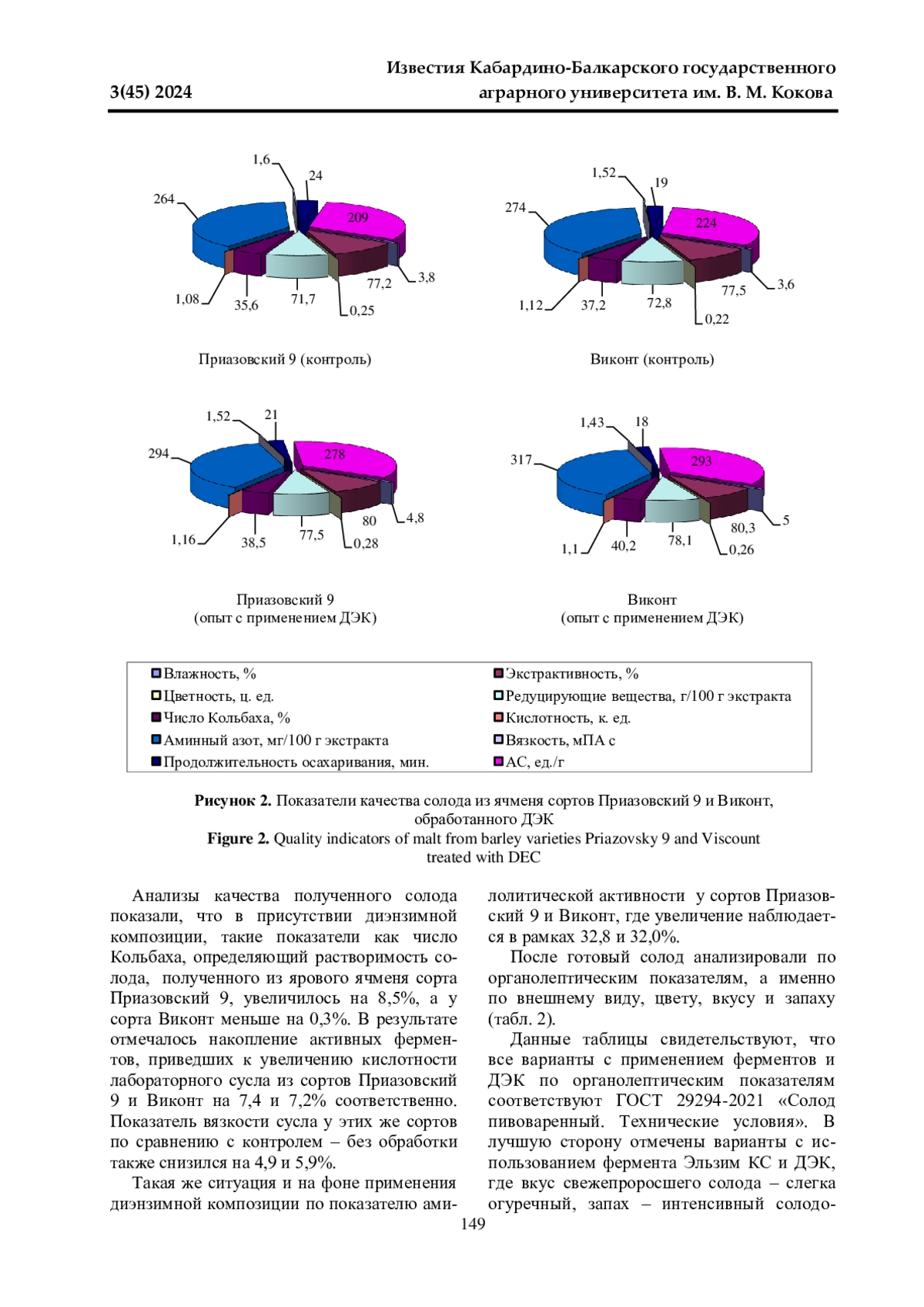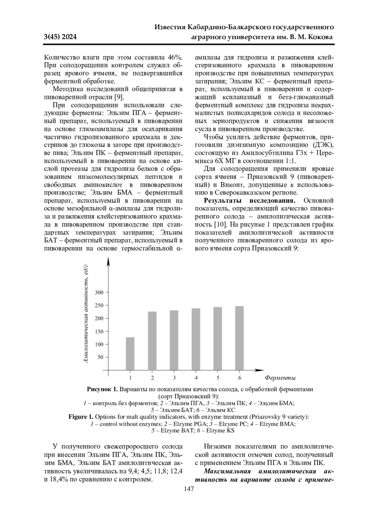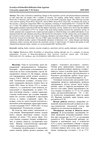 Данная работа посвящена выявлению изменений амилолитической активности и физико-химических показателей солода при обработке их комплексом ферментов. Для солодоращения применяли яровые сорта ячменя - Приазовский 9 (пивоваренный) и Виконт, допущенные к использованию в Северокавказском регионе. При солодоращении использовали следующие ферменты: Эльзим ПГА, Эльзим ПК, Эльзим БМА, Эльзим БАТ, Эльзим КС. Для усиления действия ферментов приготовили диэнзимную композицию (ДЭК), состоящую из Амилосубтилина Г3х + Церемикса 6Х МГ в соотношении 1:1. Внесение всех ферментов способствует повышению амилолитической активности солода по сравнению с контролем. Наиболее высокую амилолитическую активность имели образцы солода, приготовленные с применением Эльзим КС. Исследования показали, что внесение ДЭК в концентрации 0,1% к массе зерна во время солодоращения повышает амилолитическую активность свежепроросшего солода по сравнению с контролем и образцами солода, в которые препараты были внесены индивидуально. Определено, что лучшим растворением обладал солод, полученный при использовании Эльзим КС. У обоих сортов об этом можно судить по увеличению экстрактивности, содержанию редуцирующих веществ и аминного азота. В лучшую сторону выделился сорт пивоваренного ячменя Приазовский 9. Применение ДЭК позволило улучшить качество солода, увеличить экстрактивность, число Кольбаха, содержание сбраживаемых веществ лабораторного сусла - аминного азота и редуцирующих веществ, снизить вязкость и увеличить амилолитическую активность ферментов солода. Для улучшения качества солода, полученного из отечественных сортов ячменя, можно рекомендовать ДЭК и Эльзим КС.